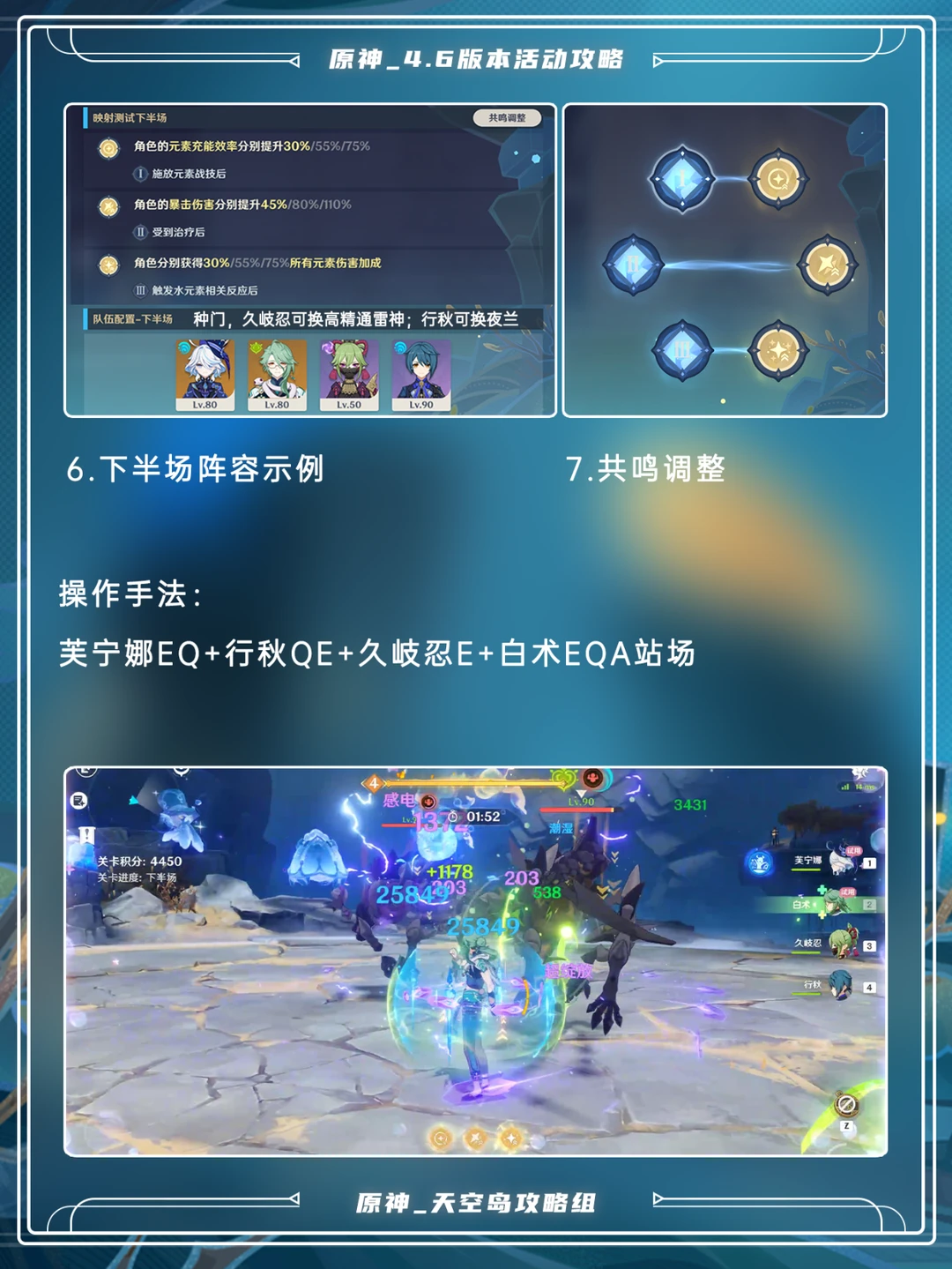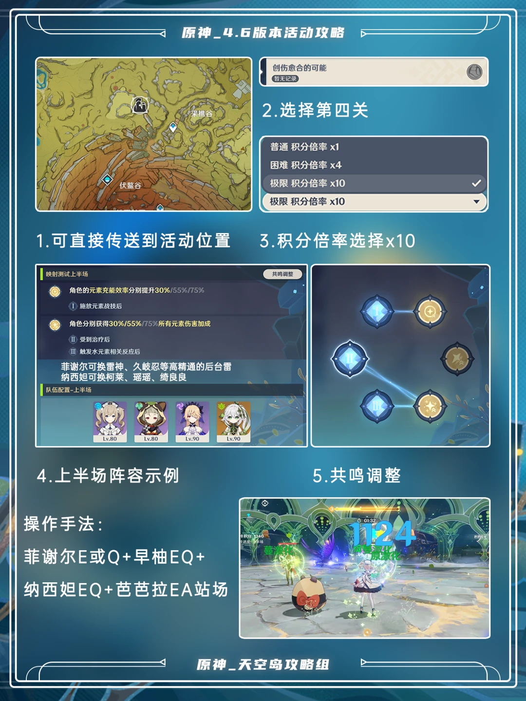 可直接传送到活动位置,推荐倍率选x10 上半:芭芭拉、早柚、菲谢尔(雷电将军、久岐忍等)、纳西妲(柯莱、瑶瑶、绮良良) 共鸣第一组横选,最后两组蓝色对应最后一个黄色[哇R] 下半:芙宁娜、白术、久岐忍(雷神)、行秋(夜兰) 共鸣也是横着选[飞吻R]