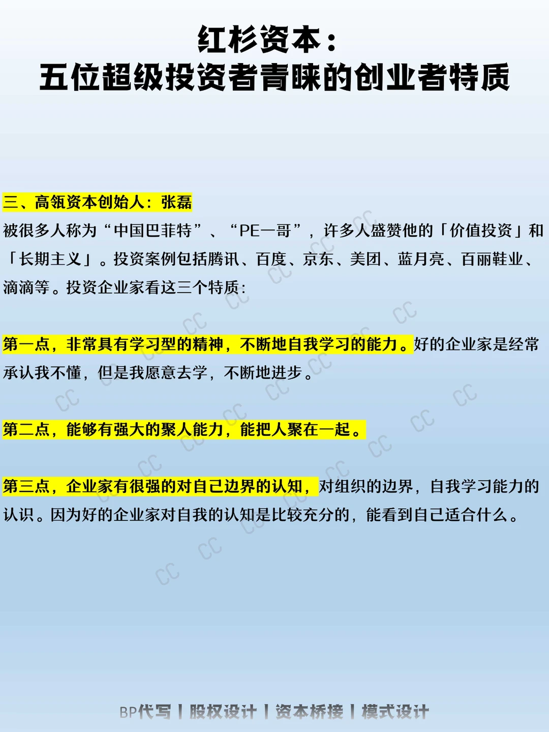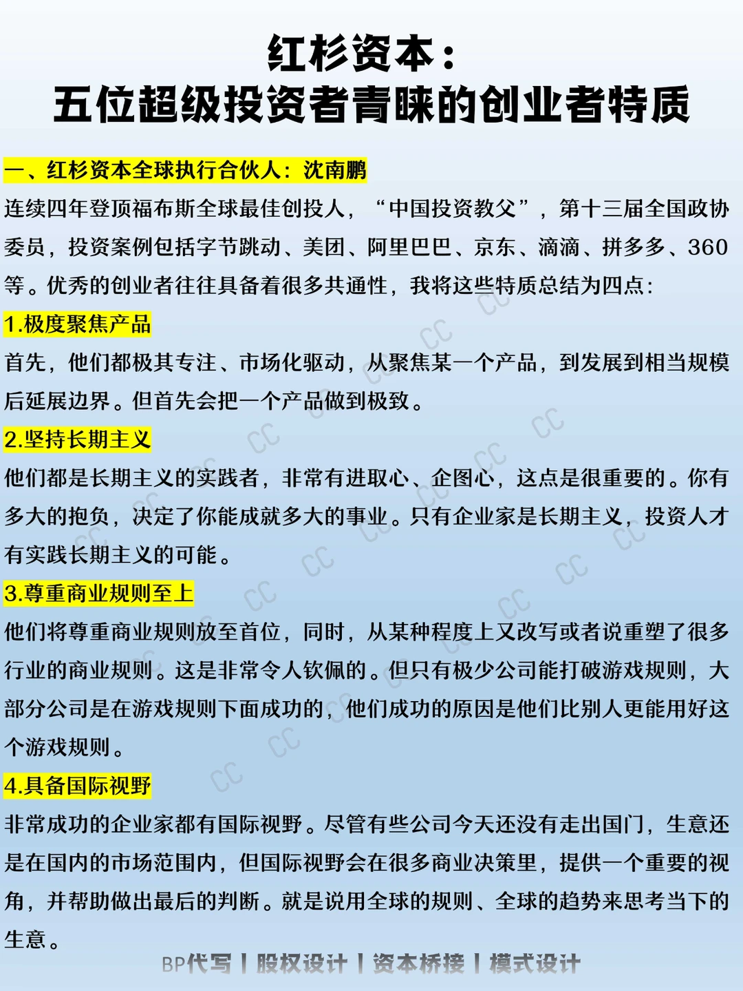 从最表面的背景方面对创业者进行了一个分析,当然投资人在考察创业者的时候,除了最简单的背景外,还会从频繁的接触交流过程中来考察创业者内在的性格和特质,去判断是不是一个真正优秀的创业者。 CC就汇总了五位投资大佬对优秀创业者特质的看法,与大家分享一二。 【1】红杉资本全球执行合伙人:沈南鹏 【2】今日资本创始人:徐新 【3】高瓴资本创始人:张磊 【4】达晨创投执行合伙人:肖冰 【5】东方富海董事长:陈玮