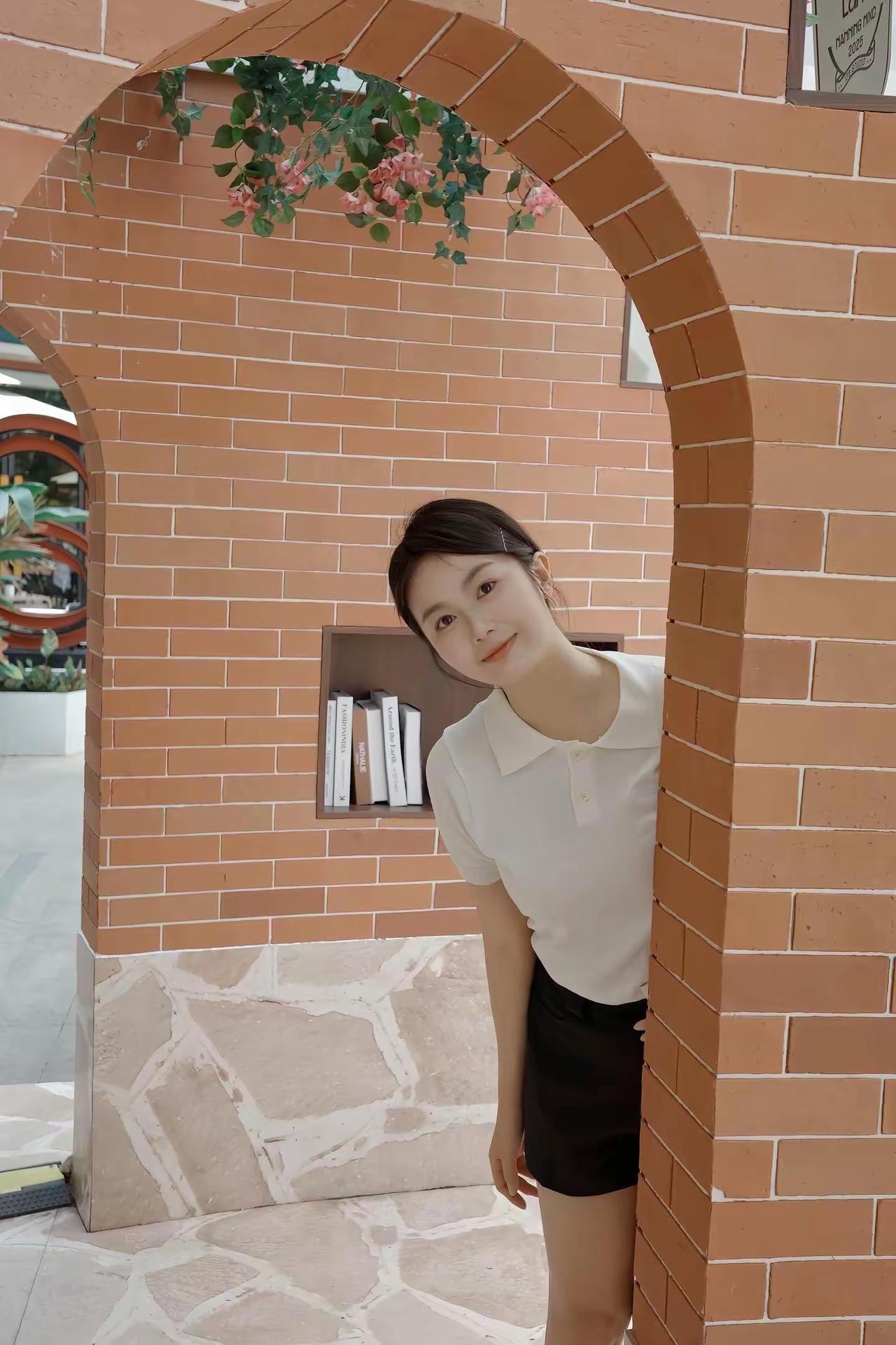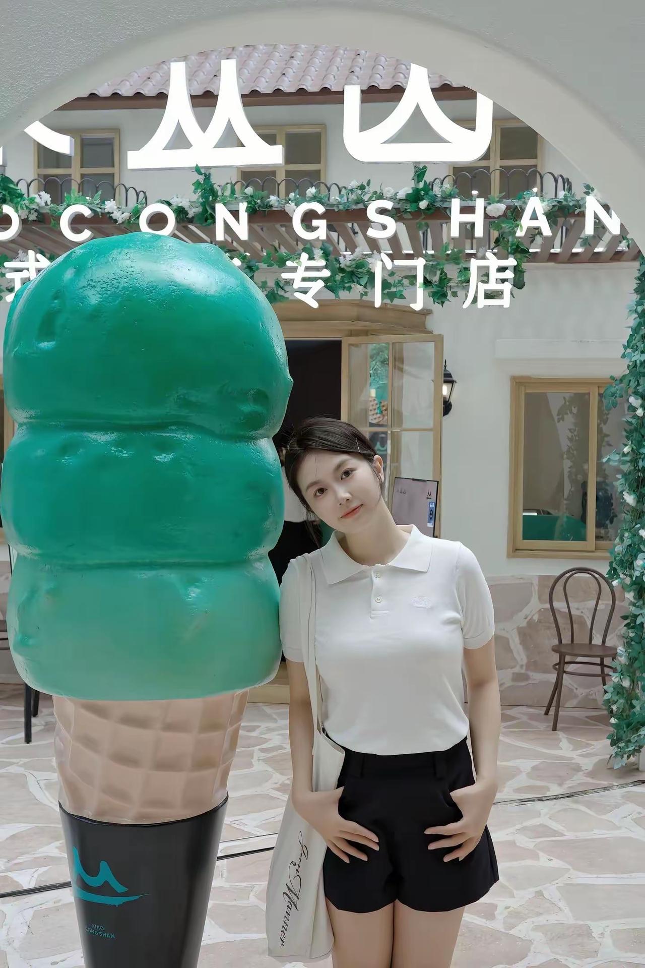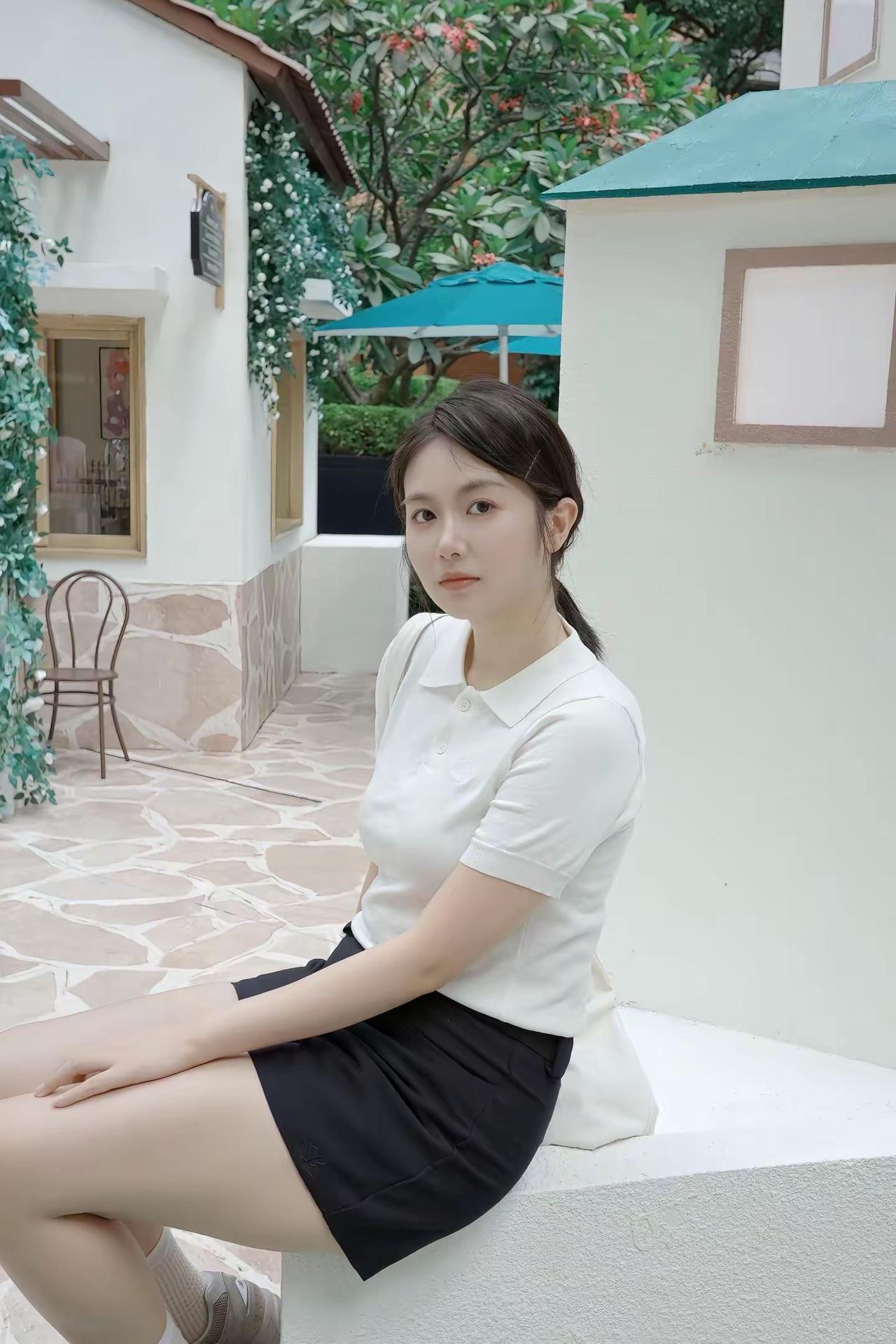 夏日穿搭:白色T恤配黑色短裤。在Wanda Land的咖啡馆里,享受悠闲的午后时