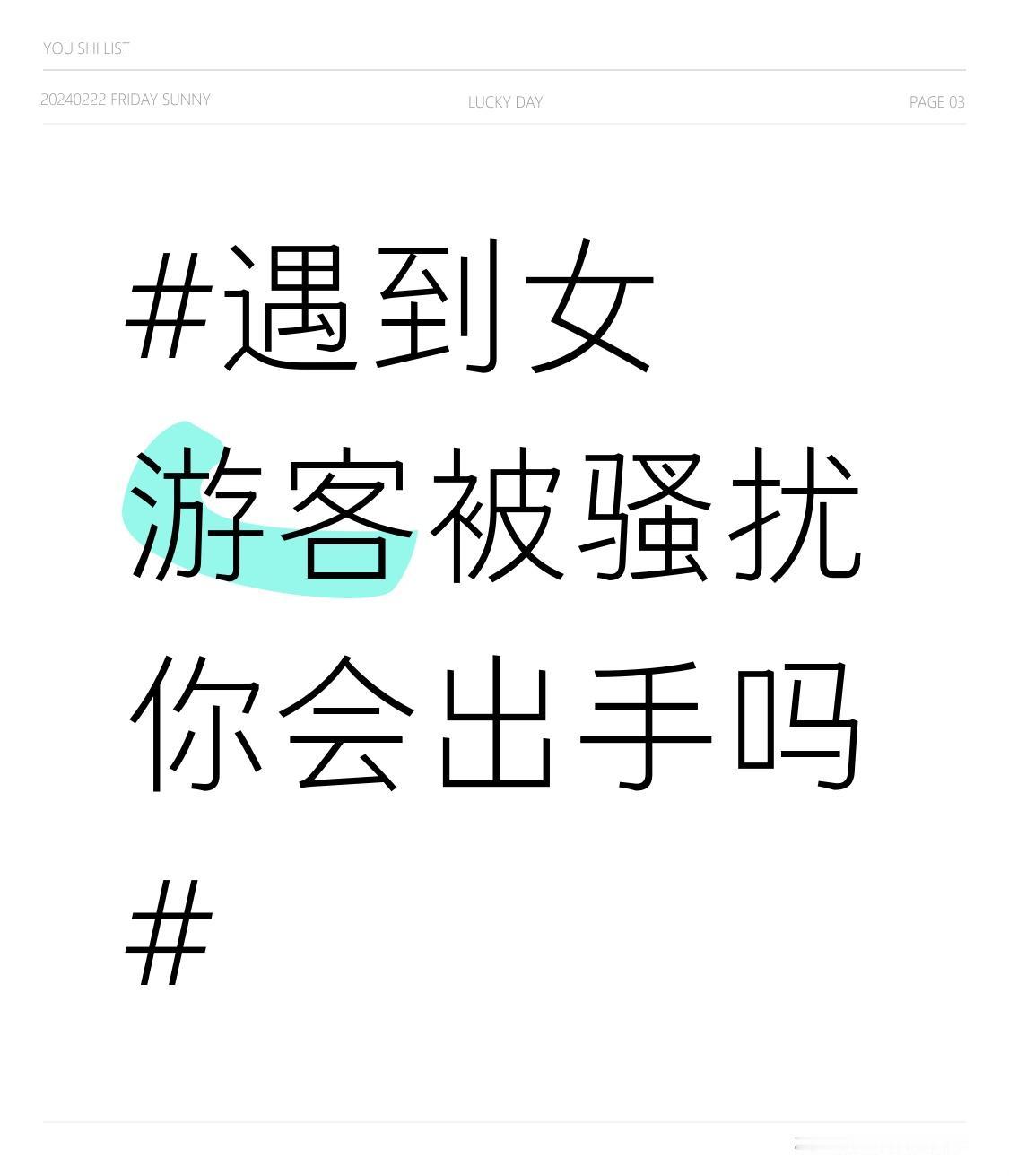 遇到女游客被骚扰,我肯定会出手。之前看到葡萄牙女游客在泰国海滩被印度男骚扰,她硬气放话“别碰我,不然我会揍你”,自己维护自己值得点赞,但旁人出手也很必要。 还有在高铁上,有男子一直骚扰旁边的漂亮小姐姐,另一位男士挺身而出制止,还担心后续又去找乘务员给小姐姐换位置。这种勇敢站出来的行为太暖了。女性遭遇骚扰本就担惊受怕,我们不能冷眼旁观,该出手时就出手,让坏人知道这种行为不被容忍,也给女性多一份安全保障。