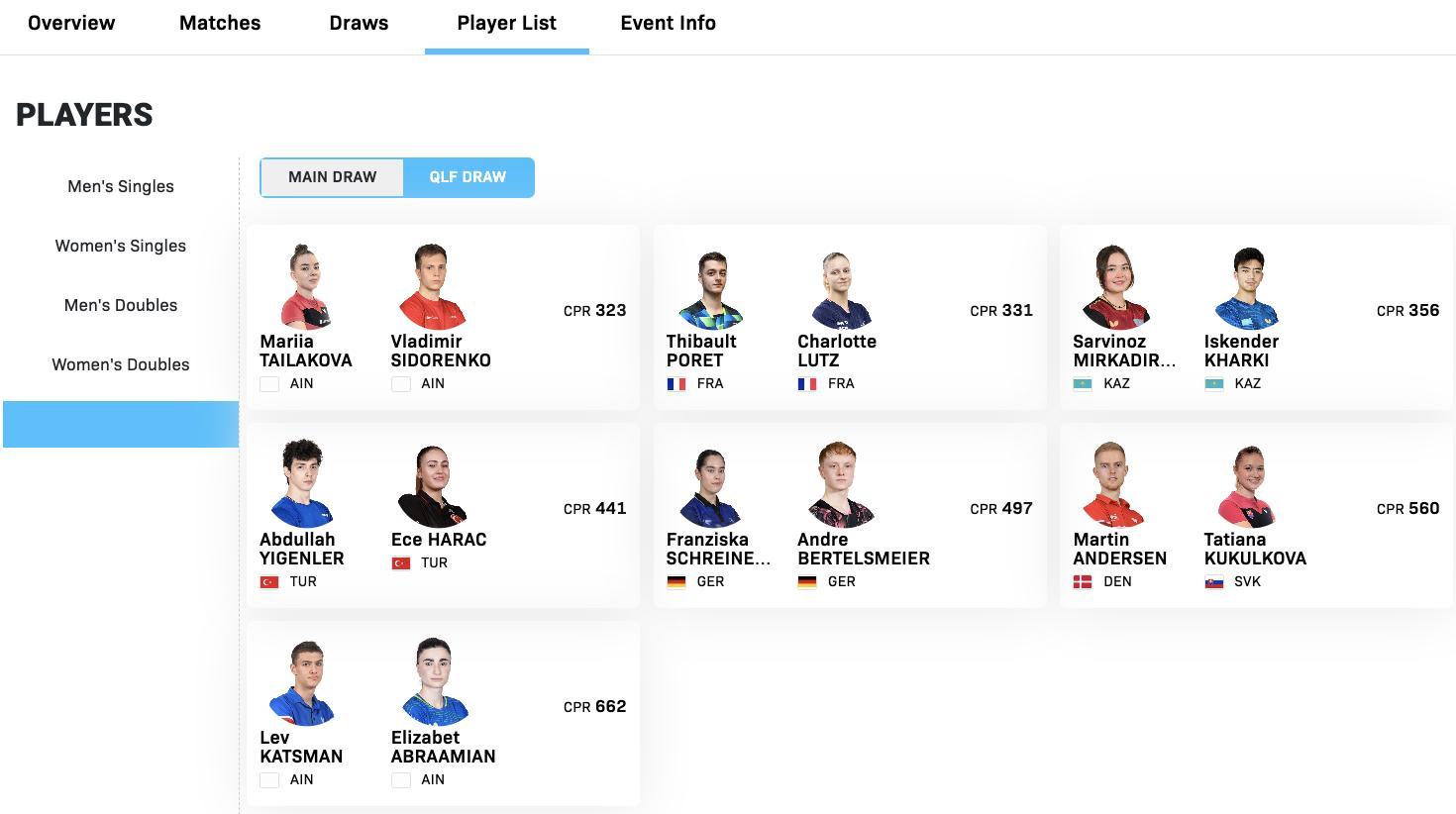 WTT常规挑战赛马斯喀特站1.19-1.24丨混双外协参赛名单【正赛】黄镇廷/杜
