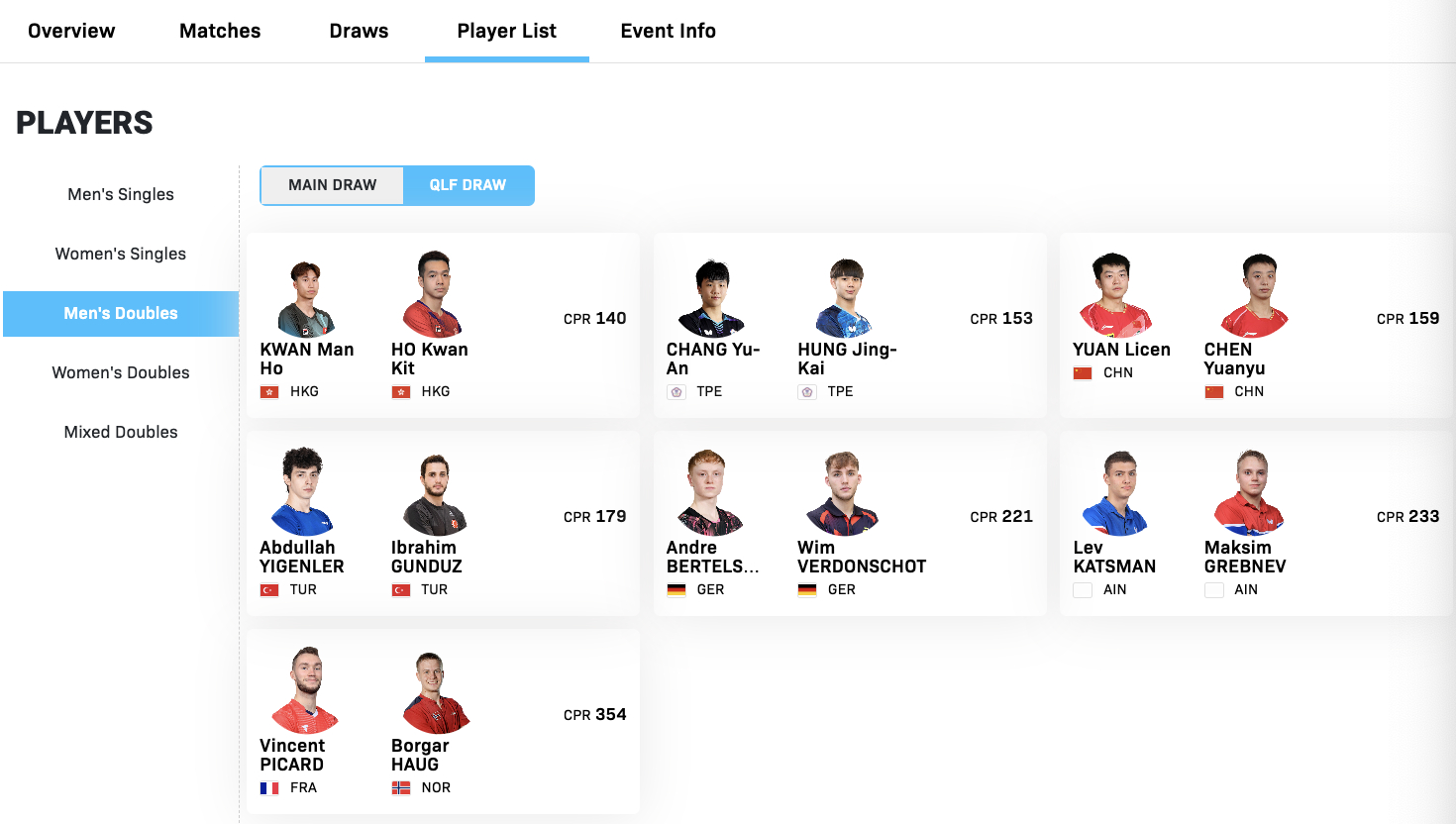 WTT常规挑战赛马斯喀特站1.19-1.24丨男双外协参赛名单【正赛】黄镇廷/陈颢桦🇭🇰、塔卡/玛纳什·沙🇮🇳、冯耀恩/郭勇🇸🇬、弗朗西斯卡/杜达🇩🇪、多尔/泊雷特🇫🇷、贾恩/巴特查尔吉🇮🇳、林兆恒/姚钧涛🇭🇰、加纳纳塞卡兰/帕尔🇮🇳【资格赛】关文皓/何钧杰🇭🇰、张佑安/洪敬恺(中国台北)、伊根勒/贡杜兹🇹🇷、贝特斯迈尔/维尔登斯考特🇩🇪、卡特斯曼/格列布涅夫(AIN)、皮卡德🇫🇷/豪格🇳🇴