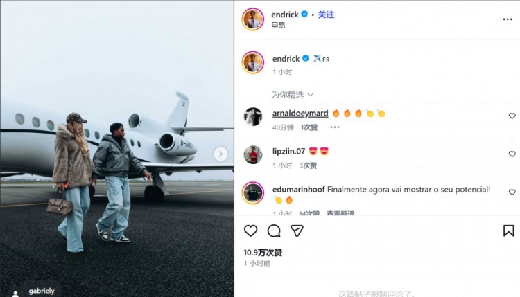 恩德里克在冬窗以租借的形式加盟里昂,租期半年,他晒出了与妻子的登机照,已经乘坐私人飞机飞往里昂与球队会合。