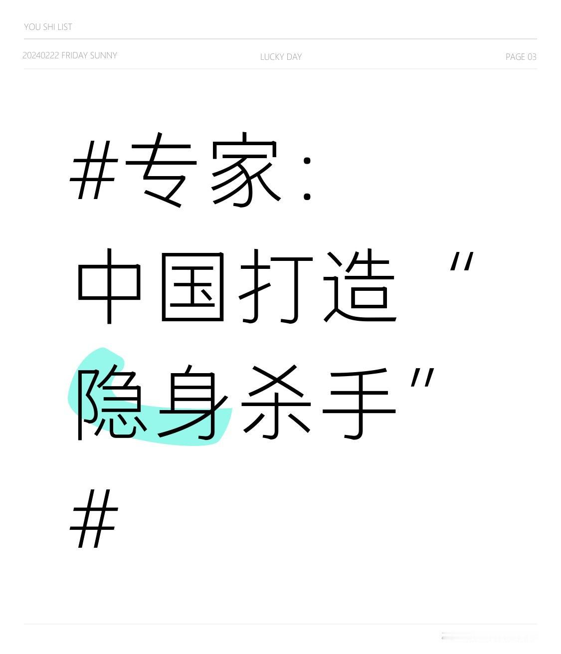 专家:中国打造“隐身杀手” 专家说中国打造“隐身杀手”,还挺让人好奇的。这里的“隐身杀手”可不止一种。比如中国科研团队研发的大面积、超柔软磁弹力传感器阵列,就像个“隐身卫士”。它能实时监测皮肤表面压力和摩擦力,为长期卧床患者预防“压疮”提供“3D导航”,要知道“压疮”可是折磨人的“隐形杀手”。另外在生物医药领域,中国药企从“跟随式创新”到“全球领跑”,像金赛药业就不断突破,其创新成果也是一种“隐身杀手”,在对抗疾病、保障健康方面发挥着关键作用。