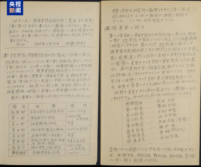 近日,侵华日军第七三一部队罪证陈列馆公布一份题为《731部队海拉尔支部部队长加藤恒则笔供》的史料。