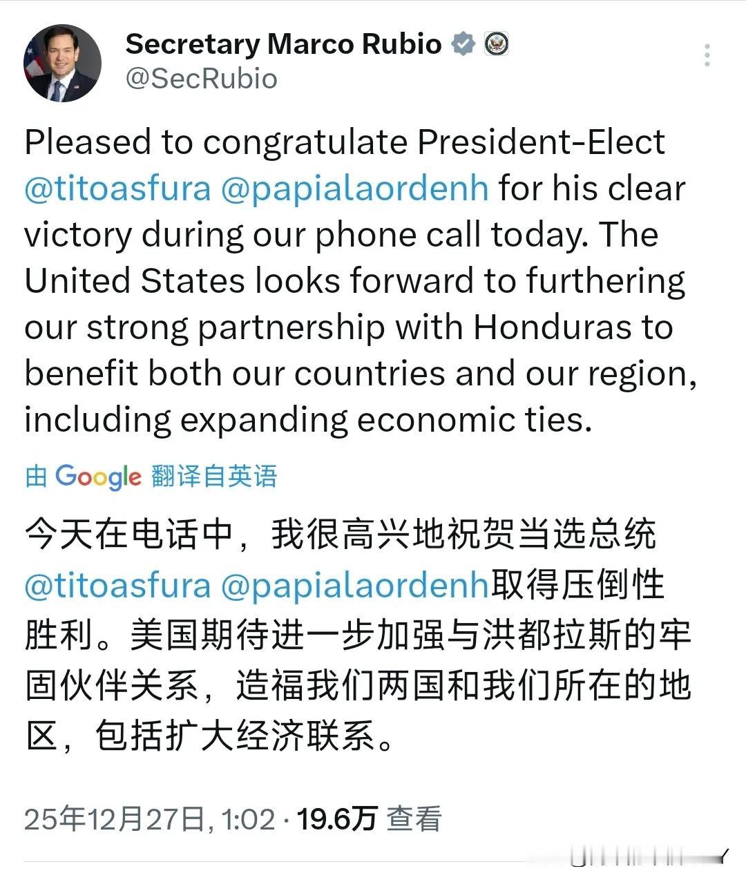 美国国务卿鲁比奥今天(北京时间12月27日)发文写道:“今天在电话中,我很高兴地祝贺洪都拉斯当选总统纳斯里·阿斯富拉取得压倒性胜利。美国期待进一步加强与洪都拉斯的牢固伙伴关系,造福我们两国和我们所在的地 区,包括扩大经济联系。” 鲁比奥字里行间满是热络,称美方期待深化与洪都拉斯的“牢固伙伴关系”,尤其要扩大经济联系,惠及两国乃至整个美洲地区。表面看是例行外交礼节,实则暗流汹涌——这通电话,远不止一句“恭喜”那么简单。 须知,阿斯富拉的胜选,背后站着一个重量级推手:特朗普。早在选举前,这位总统就多次公开力挺阿斯富拉,甚至放出狠话:“若他落选,美国将切断对洪援助。”此言一出,等于把洪都拉斯的国家命运与一人政治前途直接挂钩。 这不是寻常支持,而是赤裸裸的政治押注。为何如此上心?因为阿斯富拉的保守主义立场,与特朗普“让美国再次伟大”(MAGA)的意识形态高度同频。他反对移民潮、强调传统价值观、主张强硬治安政策——在特朗普眼中,这正是拉美需要的“自己人”。 更值得警惕的是,阿斯富拉在竞选期间曾暗示,一旦上台,或将重新审视洪都拉斯与台的所谓“邦交关系”。此言绝非空穴来风。2023年,洪都拉斯正式与我们建交,断绝与台长达数十年的“外交”往来,此举令华盛顿颇为不满。 如今阿斯富拉释放“复交”信号,正中特朗普与鲁比奥下怀。拉拢洪都拉斯,既能打击我们的外交成果,又能向岛内传递错误信号——可谓一箭双雕。但问题来了:洪都拉斯真敢冒天下之大不韪,挑战一个中原则吗? 要知道,与我们建交后,双边贸易迅速升温,中方在基建、农业、抗疫等领域提供大量务实合作。2024年,洪对华出口咖啡、棕榈油大幅增长,中企参与修建的公路网正改变偏远山区面貌。 这些实实在在的好处,岂是几句空洞口号能替代?况且,国际社会普遍承认一中原则。洪都拉斯若逆流而动,无异于自绝于主流世界。届时,它得到的或许只是华盛顿几句口头表扬,失去的却是全球合作的入场券。 古人云:“得道多助,失道寡助。”在大是大非面前,小国更需清醒:站队不如站理,投机不如守信。特朗普团队的算盘打得精明,他们试图在拉美打造一条“亲美保守联盟”。从巴西到阿根廷,从危地马拉到洪都拉斯,扶持意识形态盟友,围堵左翼势力。 阿斯富拉若真上台后转向“亲美”,将成为这条链条上的关键一环。可这种基于对抗的布局,注定短命。拉美民众要的是面包、就业与尊严,不是充当大国博弈的马前卒。近年多国政权更迭已证明:靠外部输血维系的政权,终将被人民抛弃。 鲁比奥此刻高调示好,是给阿斯富拉打气。洪都拉斯站在十字路口,一边是短期政治红利与虚幻承诺,一边是长期发展红利与战略稳定。选择前者,或可博得白宫一时欢心;选择后者,方能赢得国家真正未来。 阿斯富拉若真有治国之志,就该明白:小国生存之道,在于务实而非投机,在于平衡而非站队,在于尊重国际共识而非迎合霸权私利。