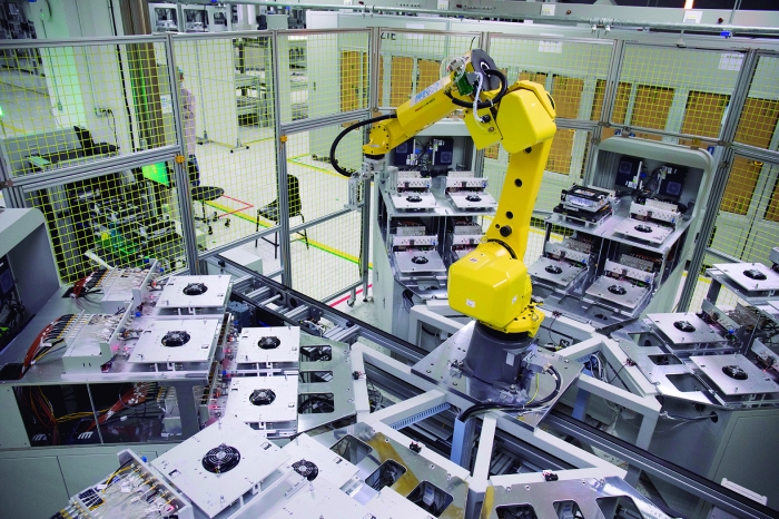 中兴通讯滨江工厂,机械臂正在进行自动化测试
