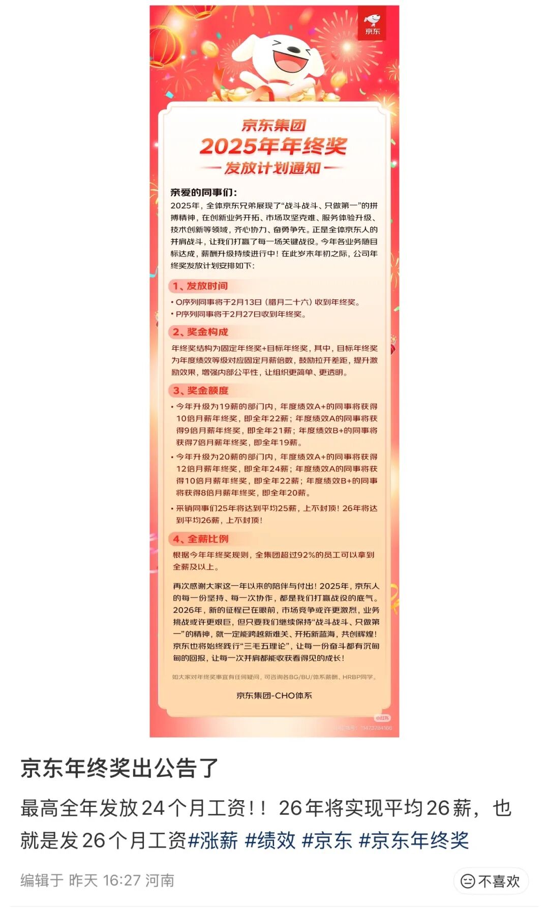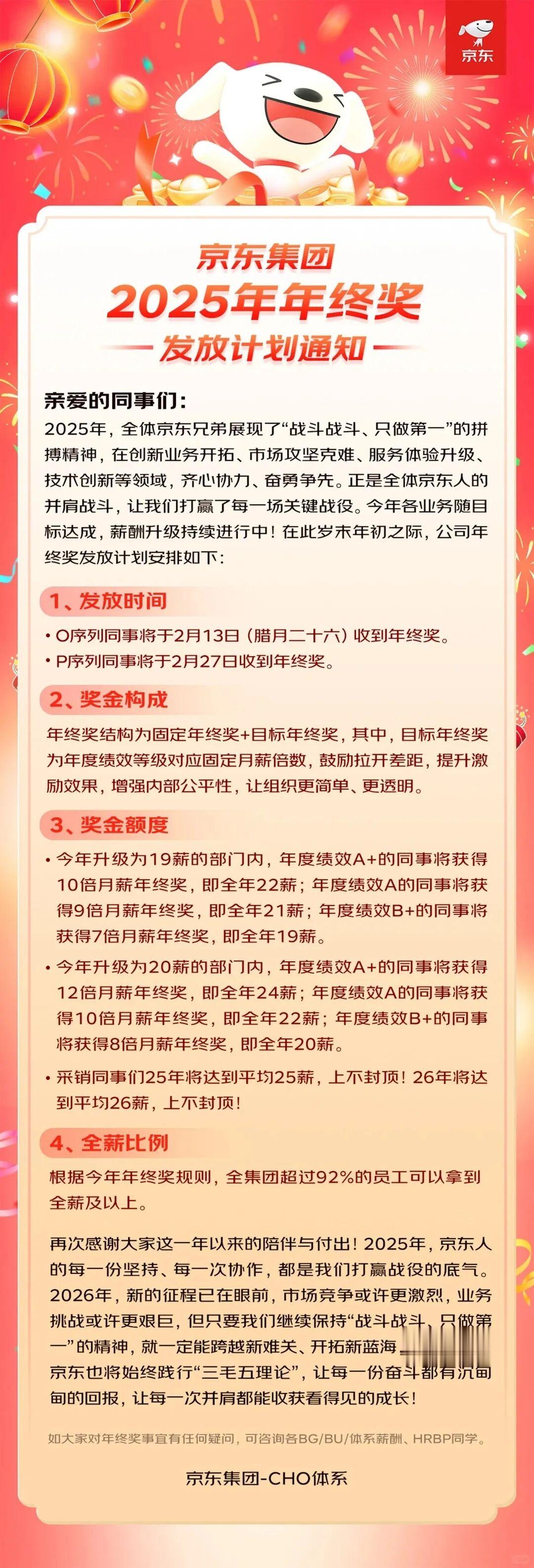 京东采销今年将实现平均25薪,上不封顶;2026年将达到平均26薪,上不封顶。根据今年年终奖规则,京东全集团超过92%的员工可以拿到全薪及以上。