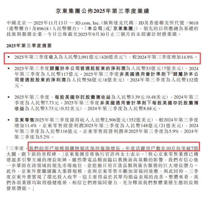 京东零售第三季度收入2506亿元,同比增长11.4%;经营利润为148亿元。京东零售业绩能实现稳步增长,主要源于平台用户规模与购物频次的强劲增长,其年度活跃用户数在今年10月份更是突破7亿大关。