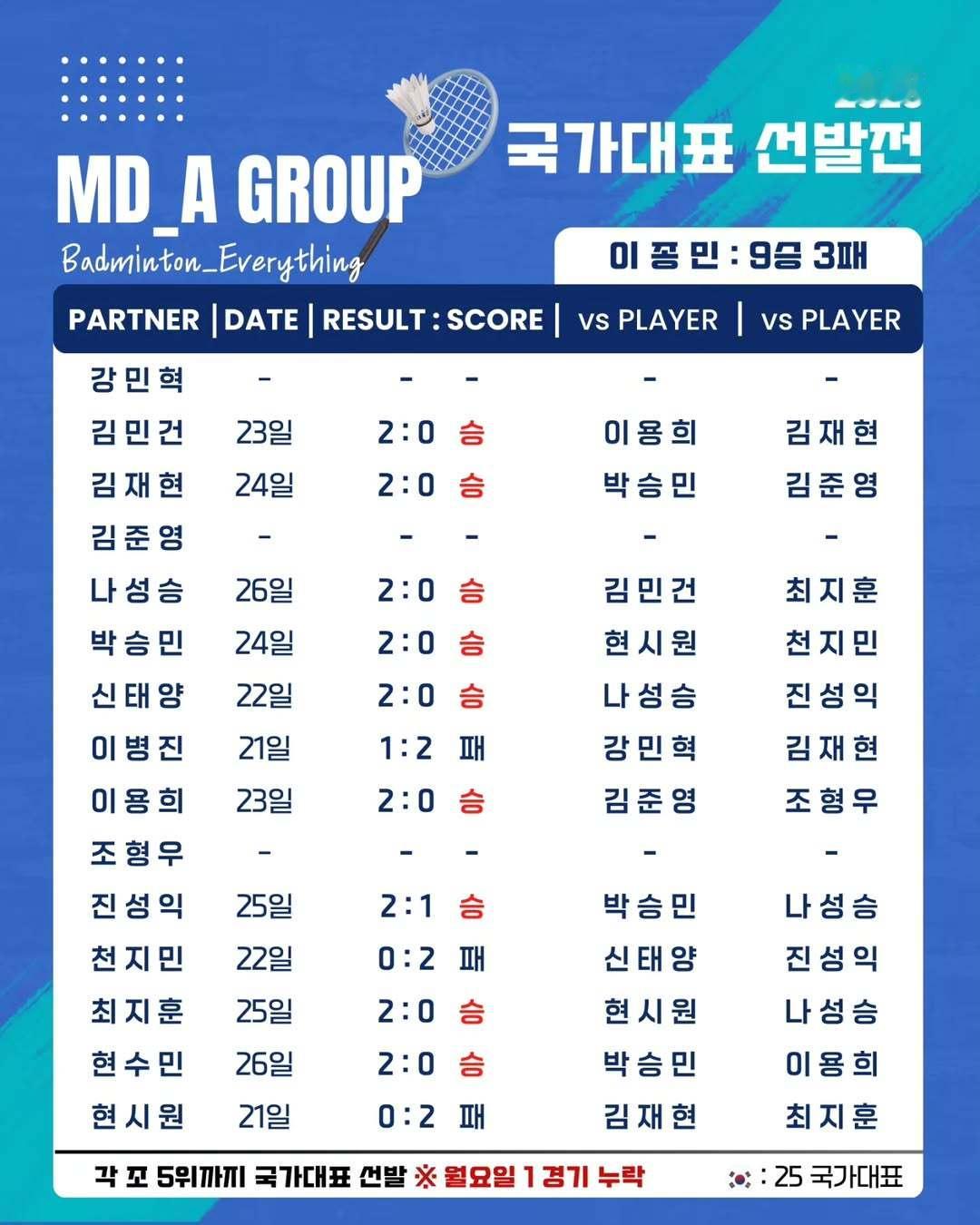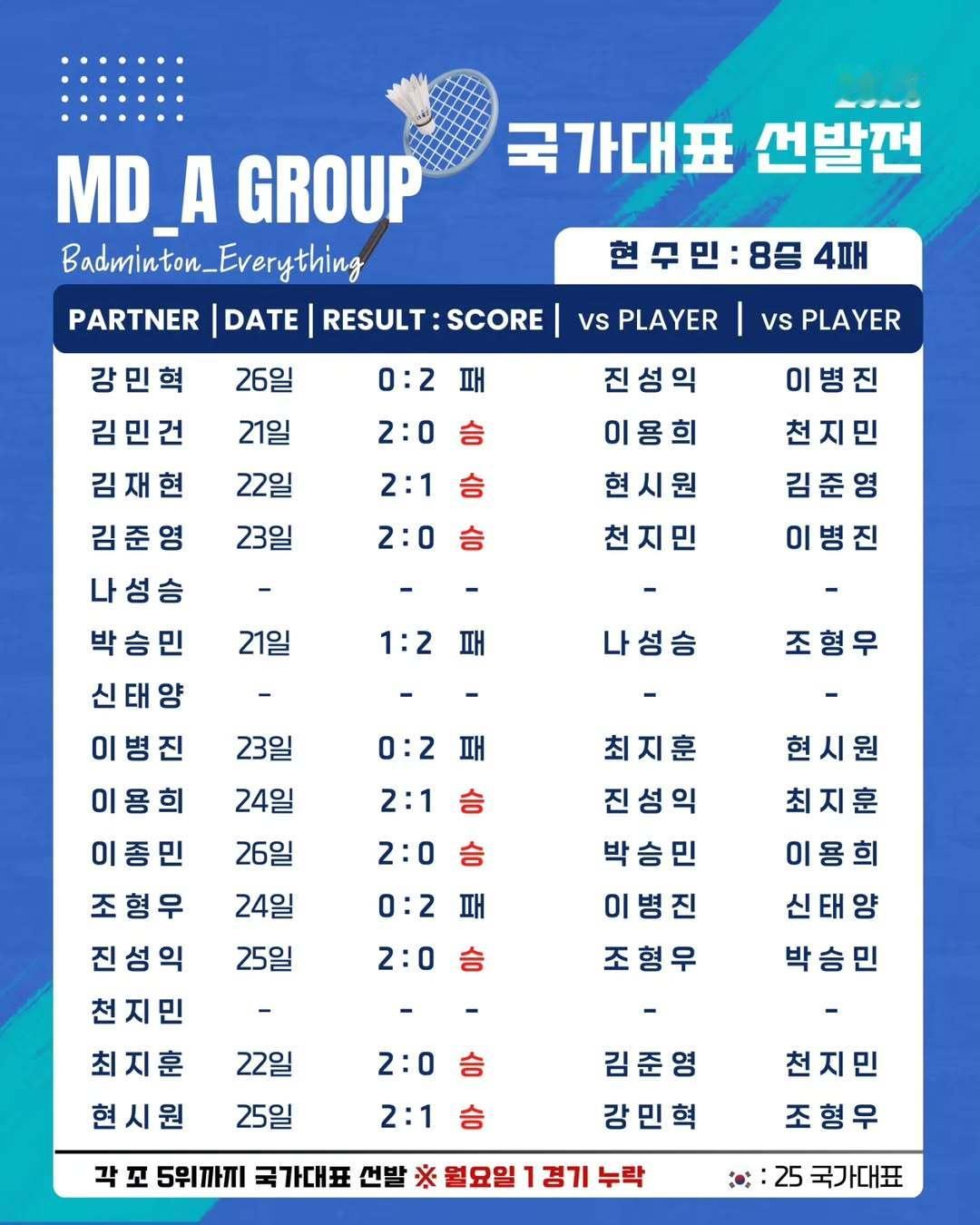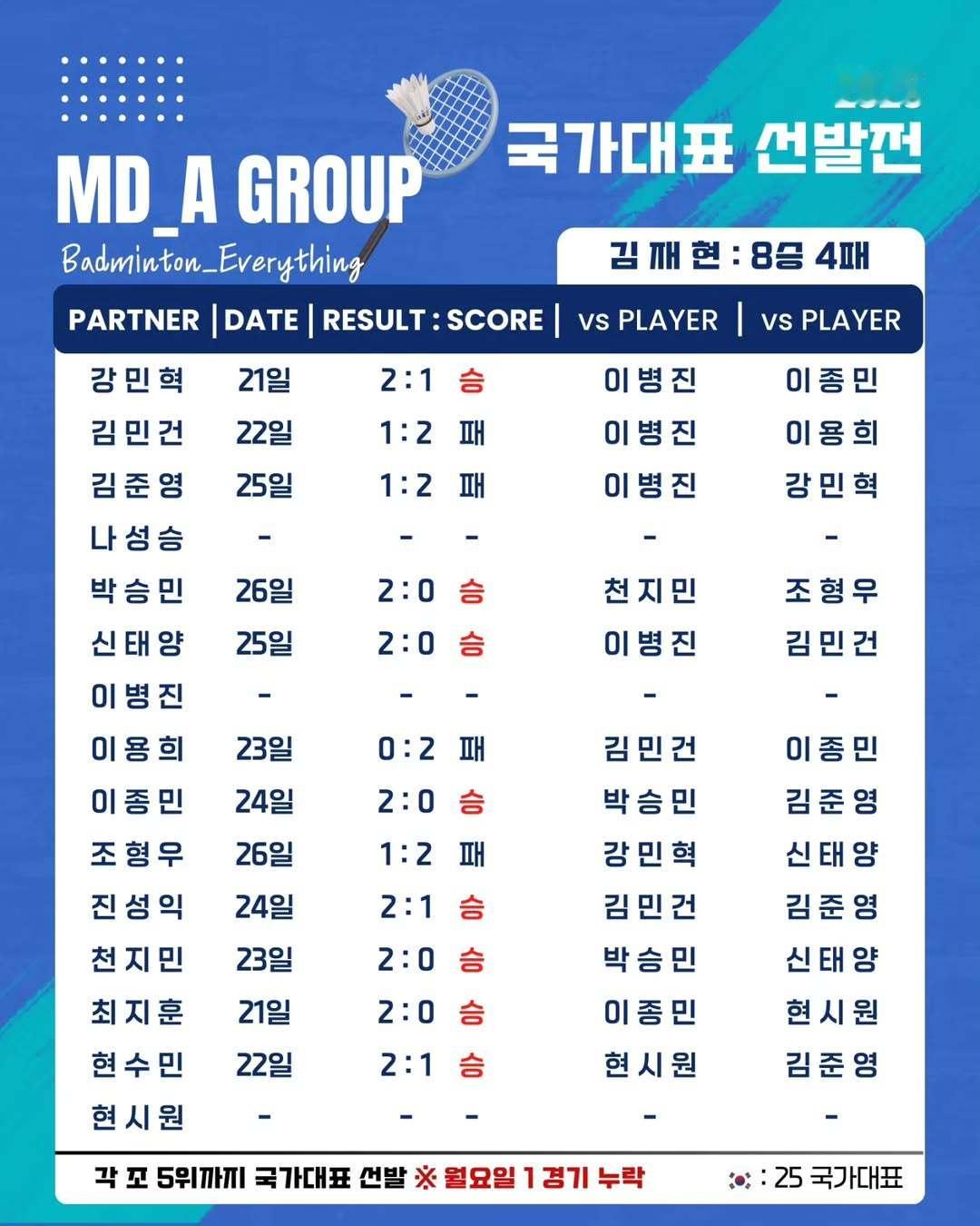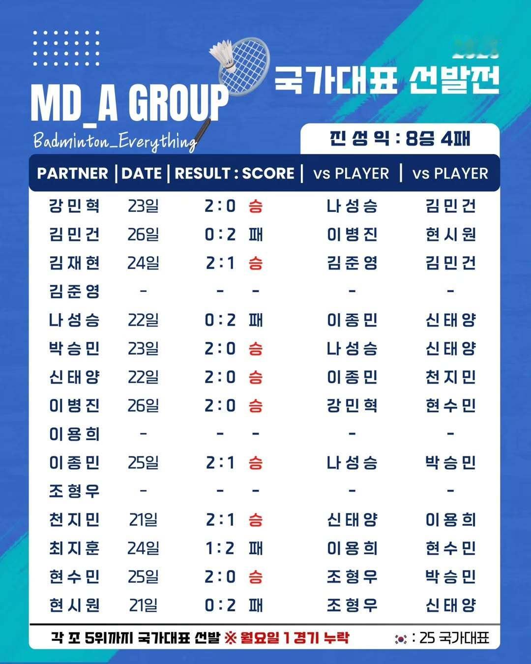 国选男双A组前六日(缺失第一日第一场赛果)1.李钟民 9胜3负2.姜珉赫3.申太阳4.金宰贤 8胜4负5.玄秀民6.真诚翊9.罗圣胜 5胜7负16.赵炯宇 3胜9负