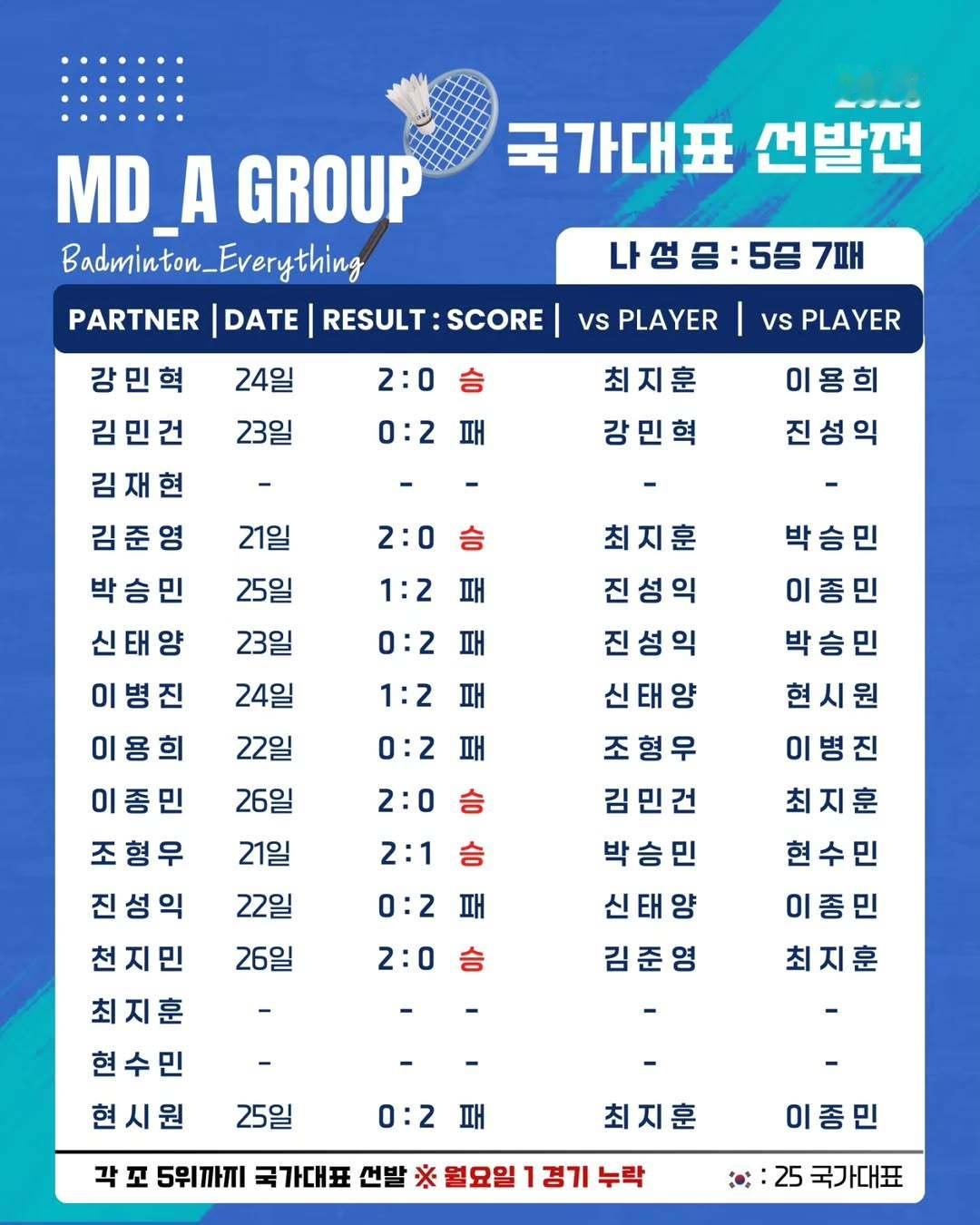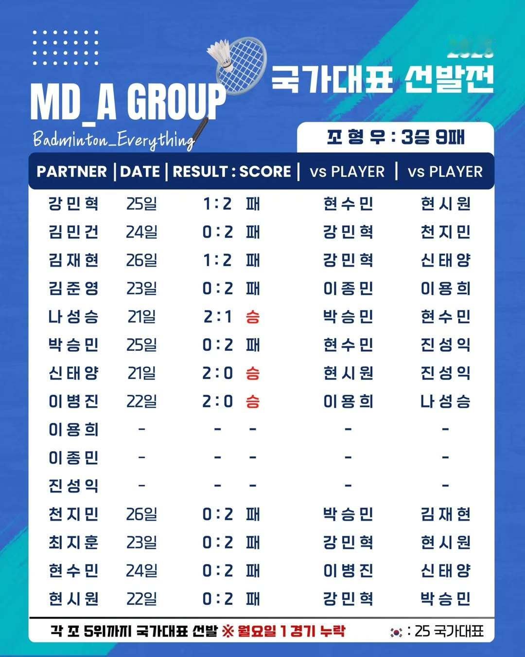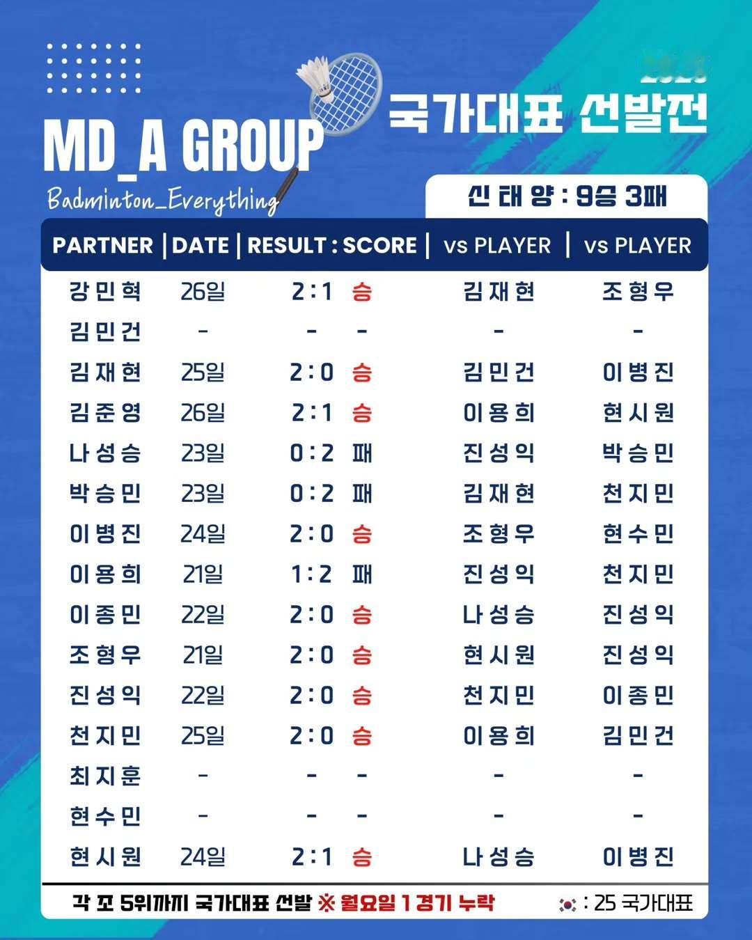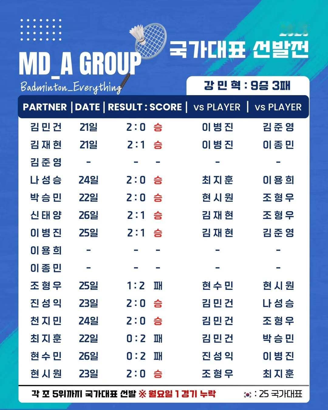 国选男双A组前六日(缺失第一日第一场赛果)1.李钟民 9胜3负2.姜珉赫3.申太阳4.金宰贤 8胜4负5.玄秀民6.真诚翊9.罗圣胜 5胜7负16.赵炯宇 3胜9负