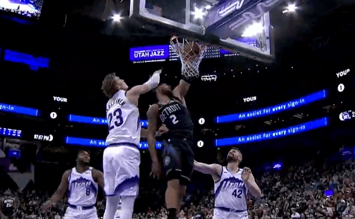 比赛的第一节,坎宁安突破单手劈扣打进,活塞打出一波11-4爵士叫停。