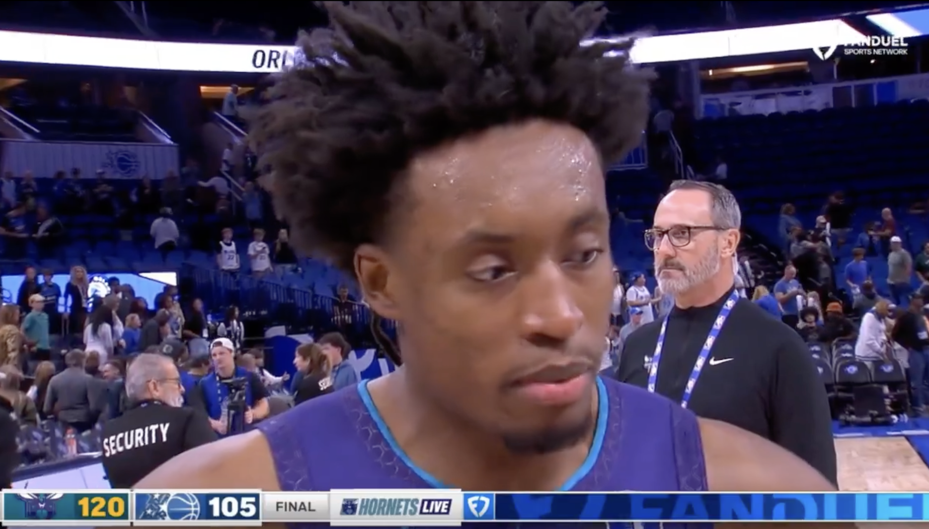 赛后黄蜂球员科林-塞克斯顿接受了记者采访,在谈到康-克尼普尔时,塞克斯顿表示:“半场休息时,我们第一件事就是围过去鼓励他、给他打气,告诉他我们自始至终都力挺他,会一直陪着他并肩作战。”