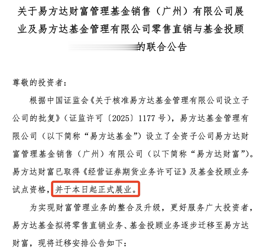 公告中称,根据中国证监会《关于核准易方达基金管理有限公司设立子公司的批复》(证监许可〔2025〕1177号),易方达基金管理有限公司(以下简称易方达基金”)设立了全资子公司易方达财富管理基金销售(广州)有限公司(以下简称易方达财富)。易方达财富已取得《经营证券期货业务许可证》及基金投顾业务试点资格,并于本日起正式展业。