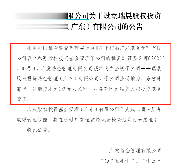 另一家基金公司巨头——广发基金也宣布全资子公司瑞晨股权投资基金管理(广东)有限公司已经完成工商注册。