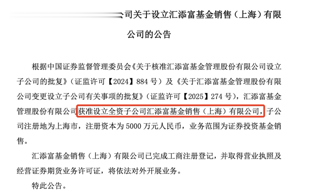 除了易方达基金之外,汇添富基金也在同日公告,全资子公司汇添富基金销售(上海)有限公司获准设立,子公司注册地为上海市,注册资本为5000万元人民币,业务范围为证券投资基金销售。