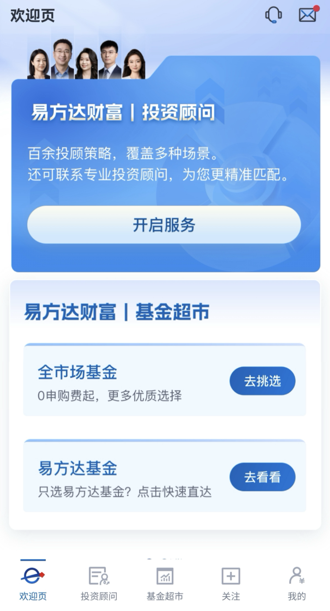 记者登录升级后的易方达“e钱包”App,跳转至易方达财富的页面。过往的直销客户升级为易方达财富客户之后,可以支持全市场基金交易,同时支持专业投资顾问服务两大板块。