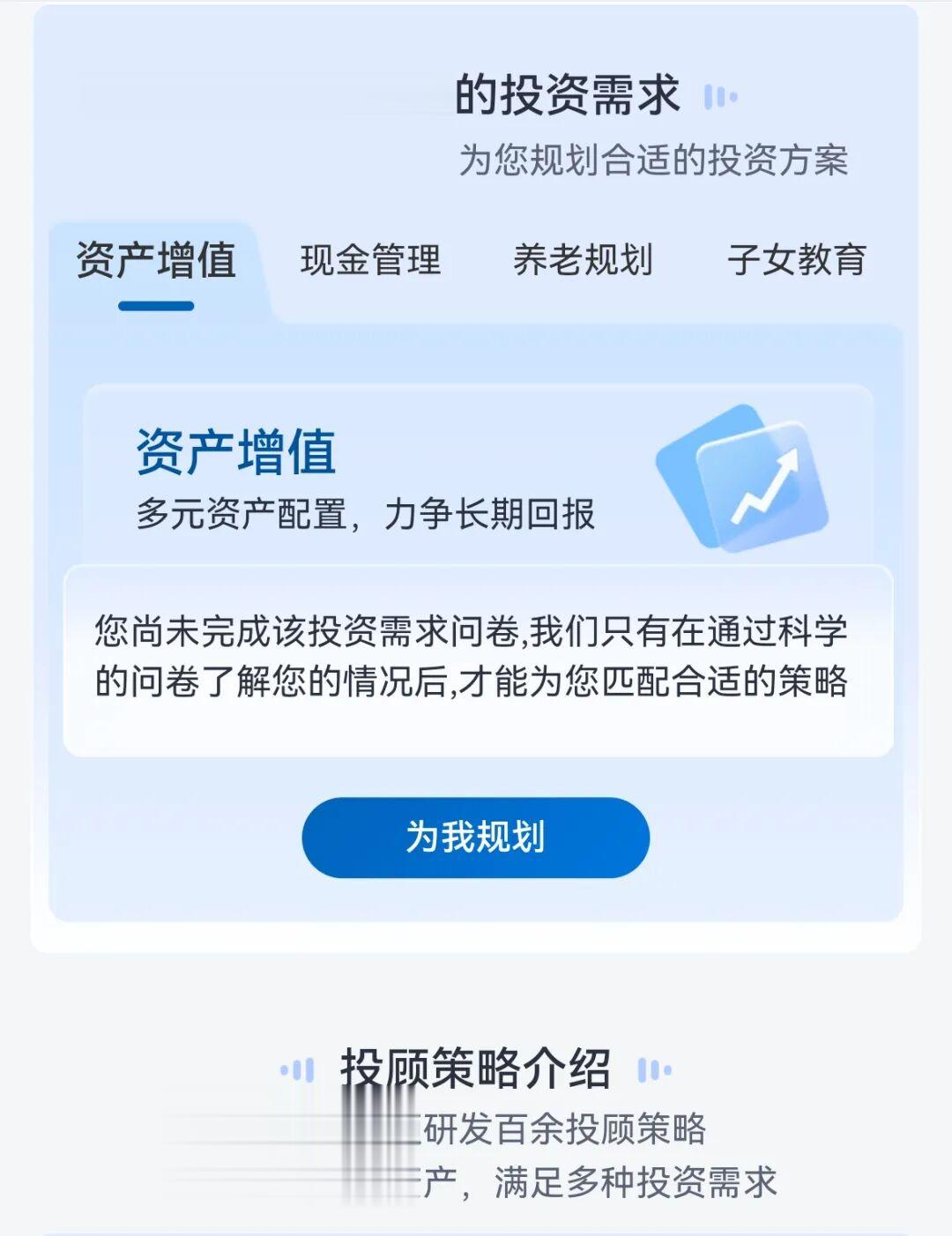 专业投资顾问服务中,分为资产增值、现金管理、养老规划、子女教育多个场景。