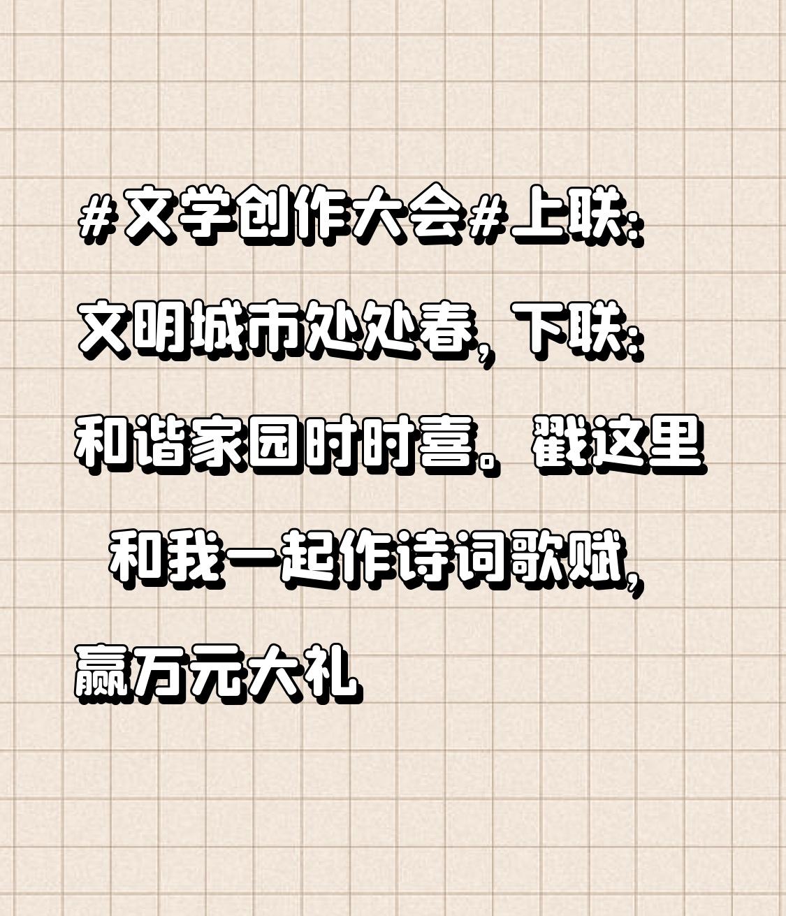 文学创作大会 这上联“文明城市处处春”,描绘出城市文明带来的生机勃勃之景,下联“和谐家园时时喜”也恰如其分地展现了家园和谐的欢快氛围。文学创作大会搞这对联活动挺有意思,能激发大家的创作热情。就像王维在《竹里馆》里,用短短几句诗营造出空灵意境;白居易的《琵琶行》,洋洋洒洒描绘出琵琶女的故事。咱们参加这大会,说不定也能创作出像唐诗一样经典的作品,还能赢万元大礼,还等啥,赶紧戳链接一起作诗词歌赋!