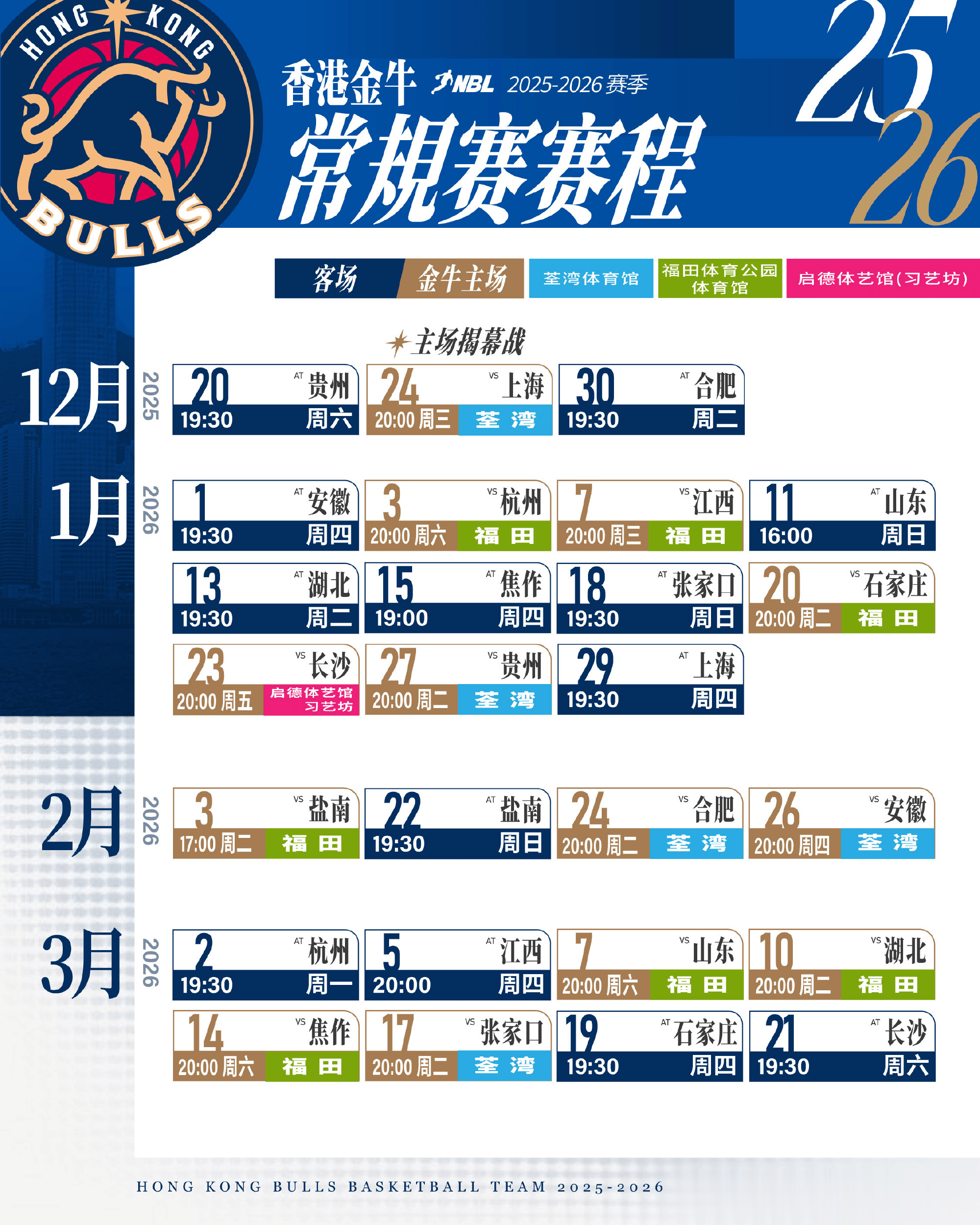 配文:2025-2026赛季NBL常规赛最新赛程及比赛场地出炉🤘🏻明年1月23日,香港金牛队将在启德体艺馆习艺坊进行比赛🤩另有4场比赛将主场设在荃湾体育馆🫶🏼俱乐部仍在积极争取更多在香港的主场赛事💪🏻如有最新进展将第一时间公布。