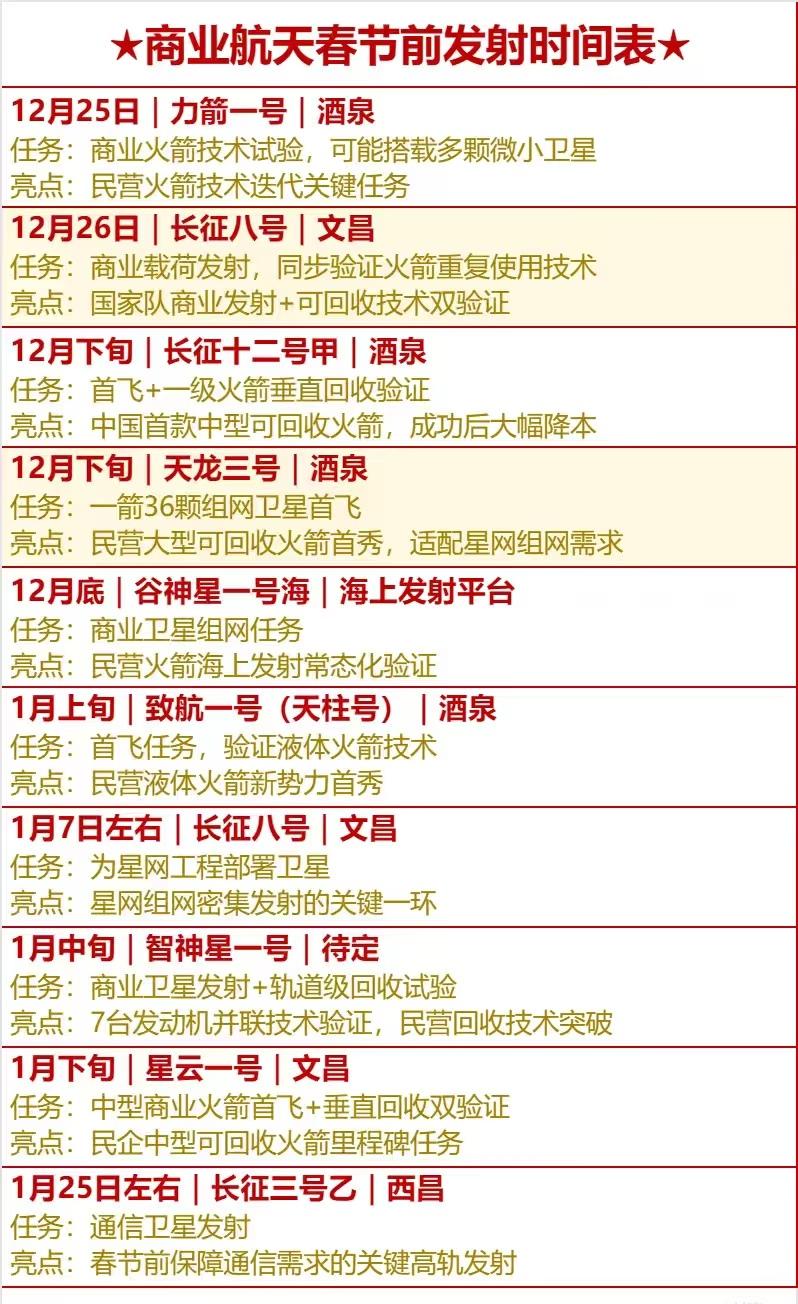科技产业链及近期热点领域梳理,主要包含三部分信息: 首先是科技产业链核心梳理,涵盖芯片/半导体、集成电路、5G/6G、人工智能、量子科技、脑机接口、人形机器人、储能、氢能源、稀土永磁、数据要素、国产信创、华为产业链、商业航天、军工与高端装备、低空经济、生物科技、网络安全、AI应用等19个关键领域,各领域列出了代表性企业,如芯片/半导体领域的中芯国际、中微公司,人工智能领域的工业富联、中科曙光,商业航天的中国卫通、中国卫星等,清晰呈现了中国科技产业链重要参与者。 其次是五大跨年主线(★必看★),聚焦当前市场关注的五大方向及对应股票:1.可控核聚变,涉及西部材料、王子新材等;2.商业航天,包括华体科技、西部材料、中天火箭等;3.无人驾驶,涵盖浙江世宝、威帝股份等;4.大消费(犒赏经济),涉及百大集团、庄园牧场等;5.AI(蚂蚁阿福+CPO),包含鹭燕医药、通鼎互联等。 最后是商业航天春节前发射时间表,详细罗列了12月25日至1月25日左右的密集发射计划,覆盖力箭一号、长征八号、长征十二号甲、天龙三号等多款火箭,涉及酒泉、文昌、海上发射平台等地点,任务包括商业火箭技术试验、卫星组网、可回收技术验证等,亮点突出,如“民营火箭技术迭代关键任务”“中国首款中型可回收火箭”“星网组网密集发射的关键一环”等,展现了春节前夕中国商业航天的高活跃度与技术突破方向。