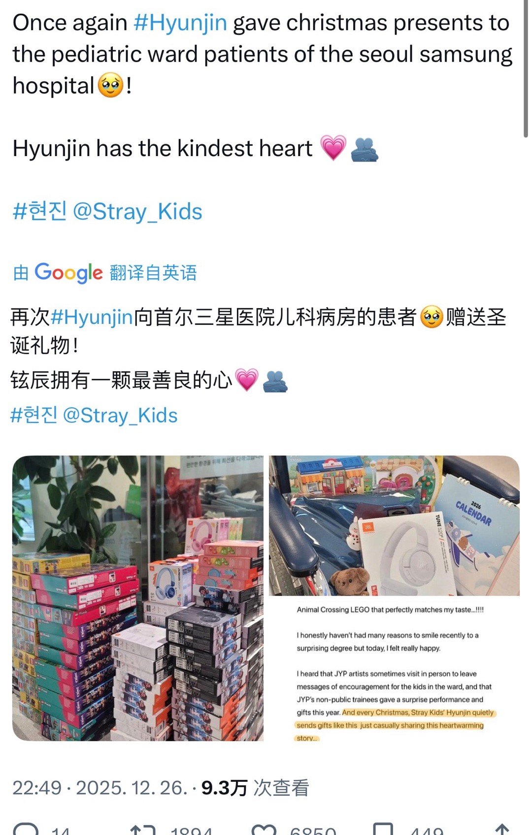 【twi】今年也给儿童医院的患儿们送了耳机作为圣诞礼物的Stray Kids黄铉辰,持续实践善意分享的铉辰尼做得好👍🏼