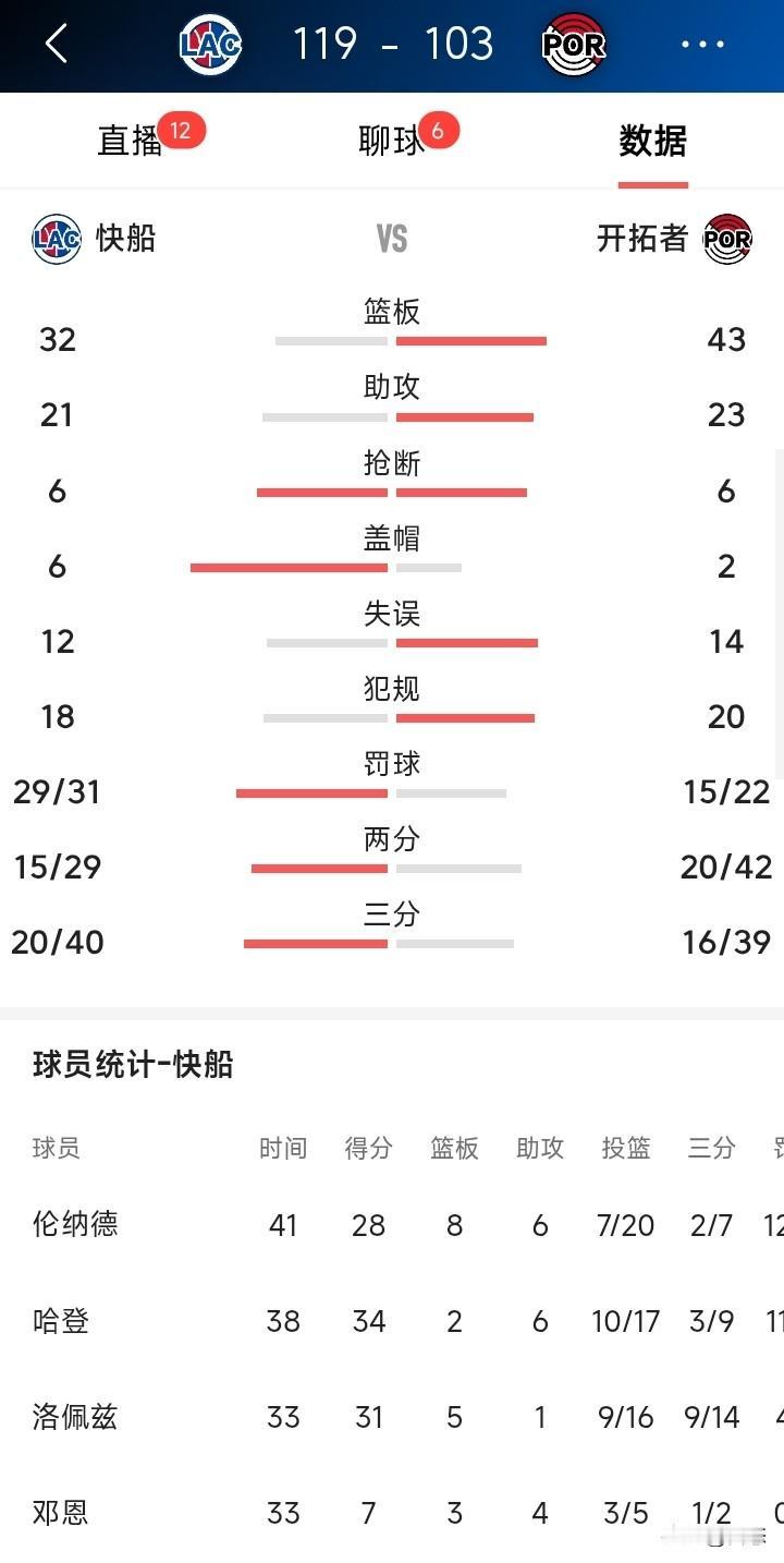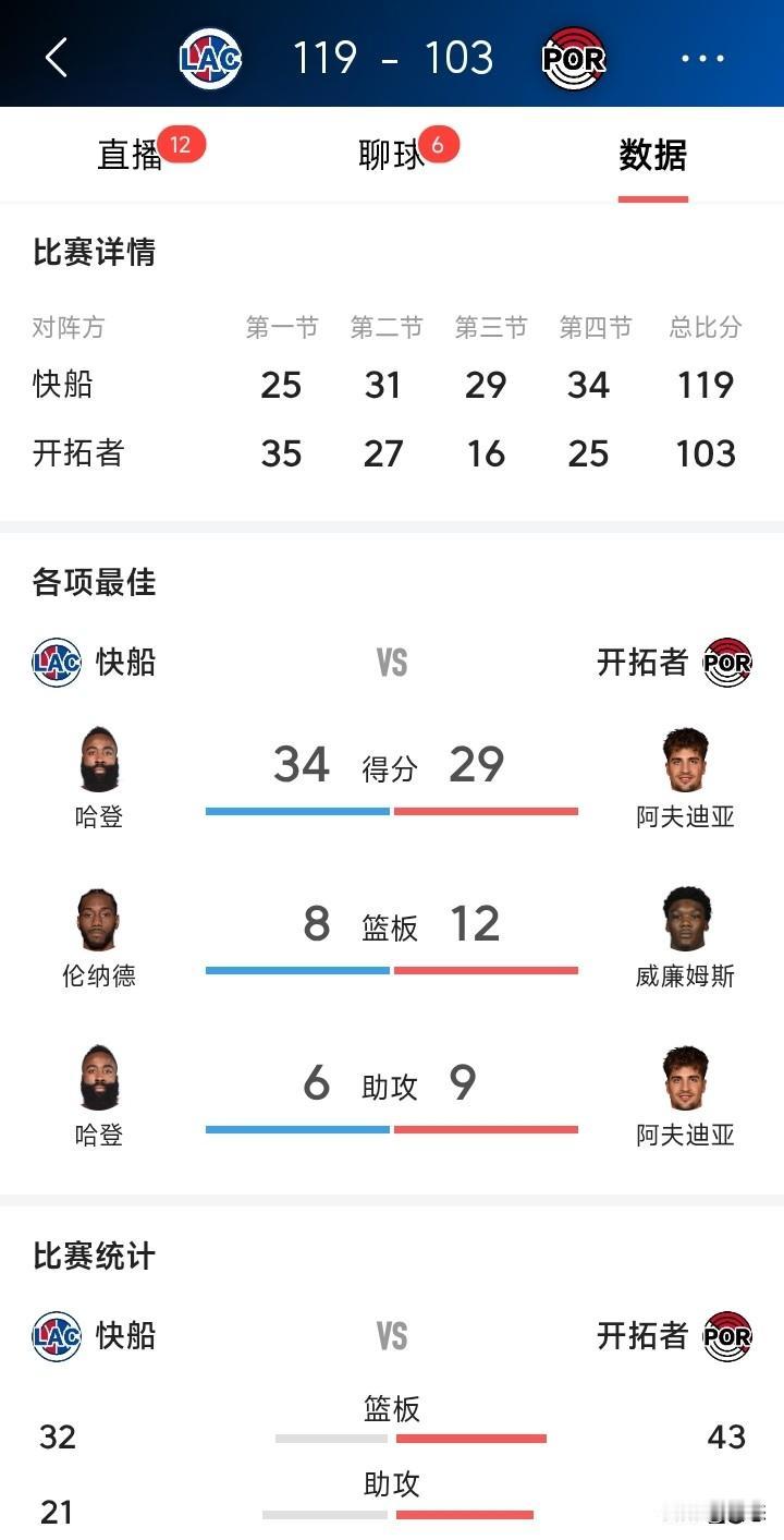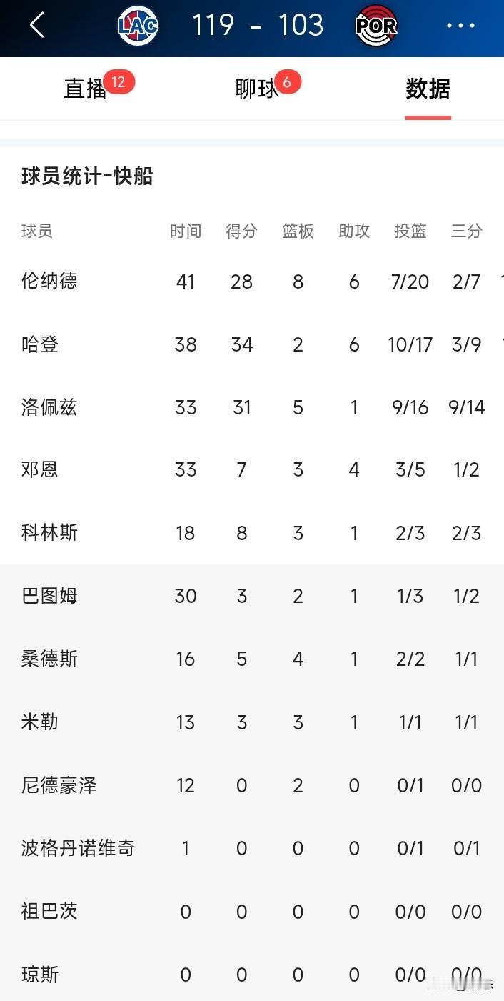 北伐开始?12月27日NBA常规赛,快船客场119 - 103大胜开拓者,拿下3连胜,开拓者则遭遇3连败。 比赛一开始,开拓者打得超猛,首节就以35 - 25领先。次节结束,仍以61 - 50拉开比分。不过下半场风云突变,快船火力全开完成逆转。 哈登爆发,砍下34分6助攻,投篮17中10,三分9中3,罚球12中11,二当家实至名归。洛佩斯也火力全开,三分14中9,拿下31分5篮板2盖帽。卡哇伊虽然投篮20中7,但罚球12中12,拿到28 + 8 + 6,攻防表现出色。反观开拓者,虽阿夫迪亚有29分9篮板9助攻,但难改败局。这场逆转之战,快船赢得太漂亮!