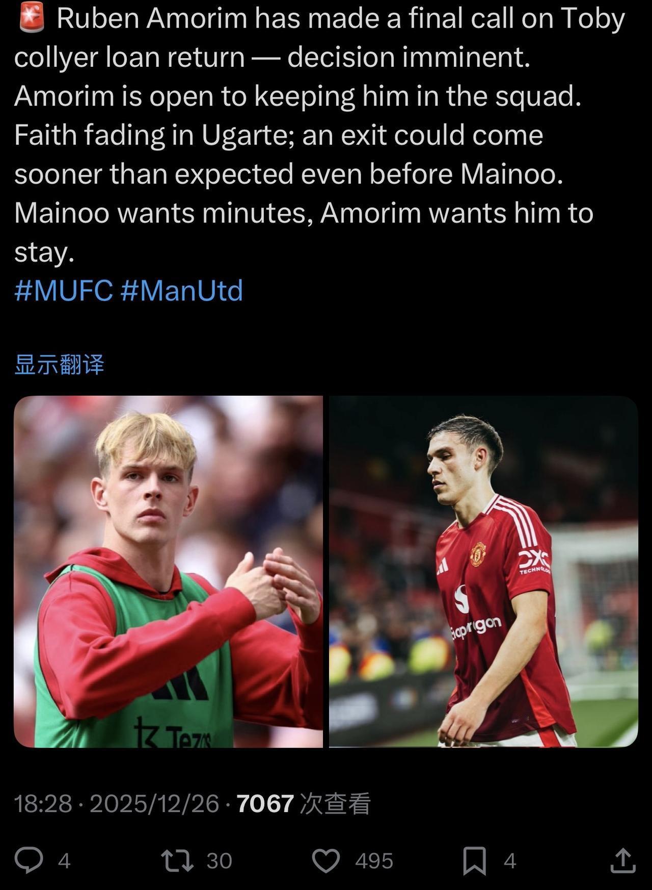 曼联卖人筹钱的顺序很明确了: 🔴乌加特会是最先选择项,但目前只有中东球队对他感兴趣。 🔴而齐尔克泽比较容易卖,罗马已经基本谈妥价格和转会方式,唯一的问题是曼联冬窗要死买不到前锋,会不会卖掉齐尔克泽? 🔴而梅努,现在是价值最低点,曼联可能更希望他下半赛季能重新踢回点身价[憨笑],同时梅努在英超有很多球队关注他,曼联根本不担心卖不掉他,所以价值最大化是最重要的。 ……………………………………………………………… 鲁本·阿莫林已就托比·科利尔的租借回归做出最终决定——即将公布。阿莫林倾向于让他留在队中。乌加特的信心正在减弱;他的离队时间可能比预期更早,甚至可能早于梅努。梅努渴望上场时间,而阿莫林希望他留队。
