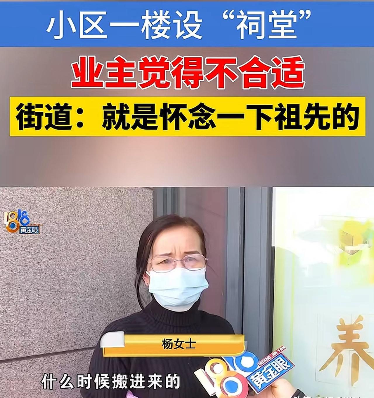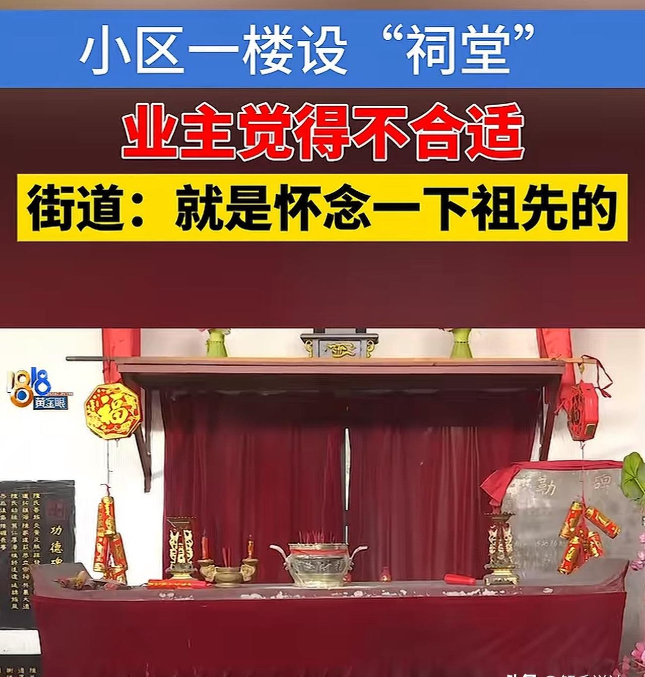 楼下一夜变祠堂, 女子怒了, 合不合法? 宁波朱家苑小区的杨女士最近碰到件闹心事。 她住了十多年的楼下三间商铺,一直以为是家医馆,结果今年冬至发现,里面摆上了“陈氏大德堂”的牌匾,还有神位、香台,原来是被改成了祠堂。 杨女士当场就懵了。 这地方临街又挨着住宅,平时人来人往,突然搞个祭祖的地方,心里实在膈应。 她去找街道反映,对方说就是祭拜祖先,没办白事也没搞迷信,每年就冬至来一趟,不算啥大事。 可杨女士不买账。 她说就算不天天开门,这种场所放在居民楼底下,祭祀时有人进出、烧香、念词,影响大家生活是肯定的。 关键是这事根本没跟其他业主商量过,凭什么他们想改就改? 记者去看了,门挂着“大德世家”的牌子,里面窗帘拉得严实,但从门缝能看到神位和供品,确实是个祠堂。 街道解释说,这小区是五个村合并的,连城村的陈姓村民拆迁后舍不得祖宗资料,就把祠堂搬了进来,还立了碑说明情况。 墙上贴着家风家训,也挂了尊老爱老的标语,说是想把传统和现代结合。 但问题不在动机,在程序。 按《民法典》,商铺自己用可以,但要改用途,尤其涉及到公共区域使用,比如门口通道有人祭拜走动,就得全体业主投票,面积和人数都得超四分之三同意才行。 而且,就算他们有这三间房的使用权,也没权力影响别人正常生活。 噪音、烟味、人员进出,都是实实在在的问题。 法律保护缅怀先人,但也保护其他业主的权利。 现在这事吵到了网上,有人说拆迁安置本就该互相理解,家族有祠堂不容易;也有人支持杨女士,说公共生活得讲规矩,不能谁占了地方就自己说了算。 关键是手续有没有办全。 如果真没走投票流程,也没做公示,那这个祠堂哪怕再“文明”,也站不住脚。 情感归情感,规则归规则。 没人反对祭祖,但得在合适的地方、按规矩来。 不是所有事,一句“传统”就能盖过去的。