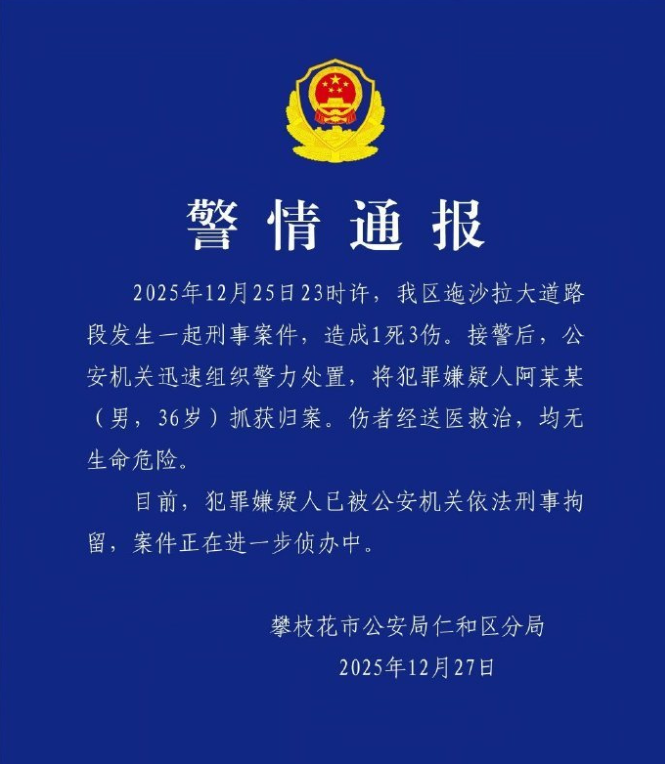 2025年12月25日23时许,我区迤沙拉大道路段发生一起刑事案件,造成1死3伤。接警后,公安机关迅速组织警力处置,将犯罪嫌疑人阿某某(男,36岁)抓获归案。伤者经送医救治,均无生命危险。