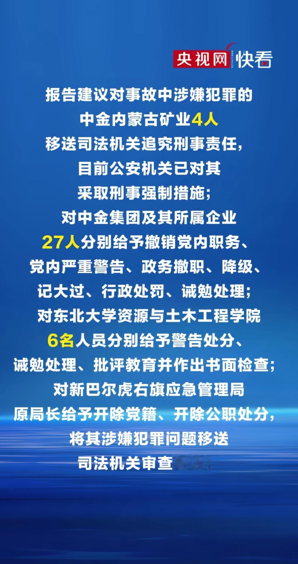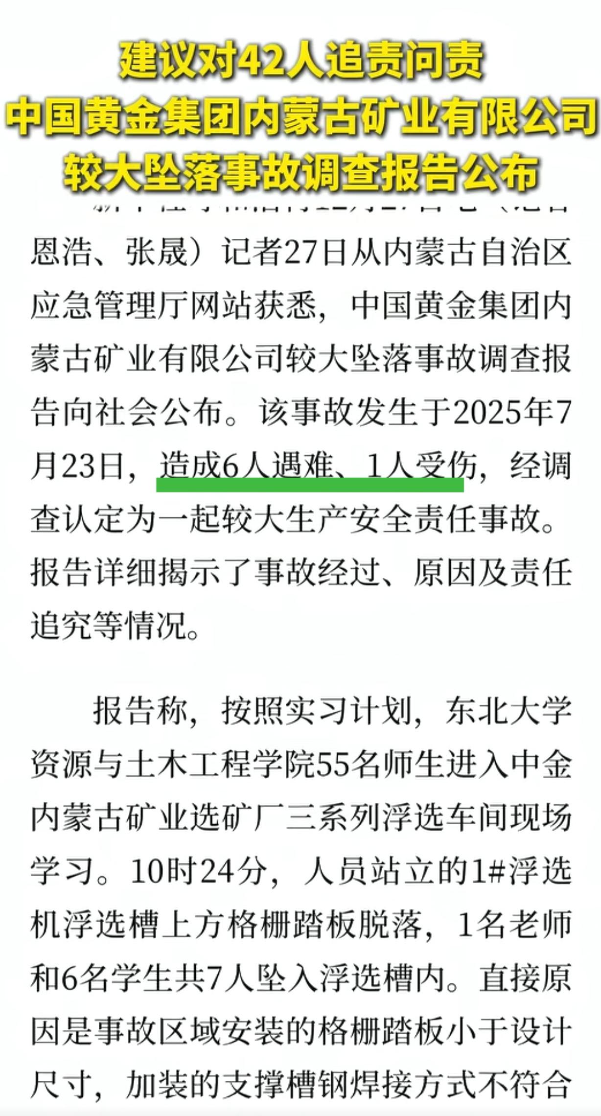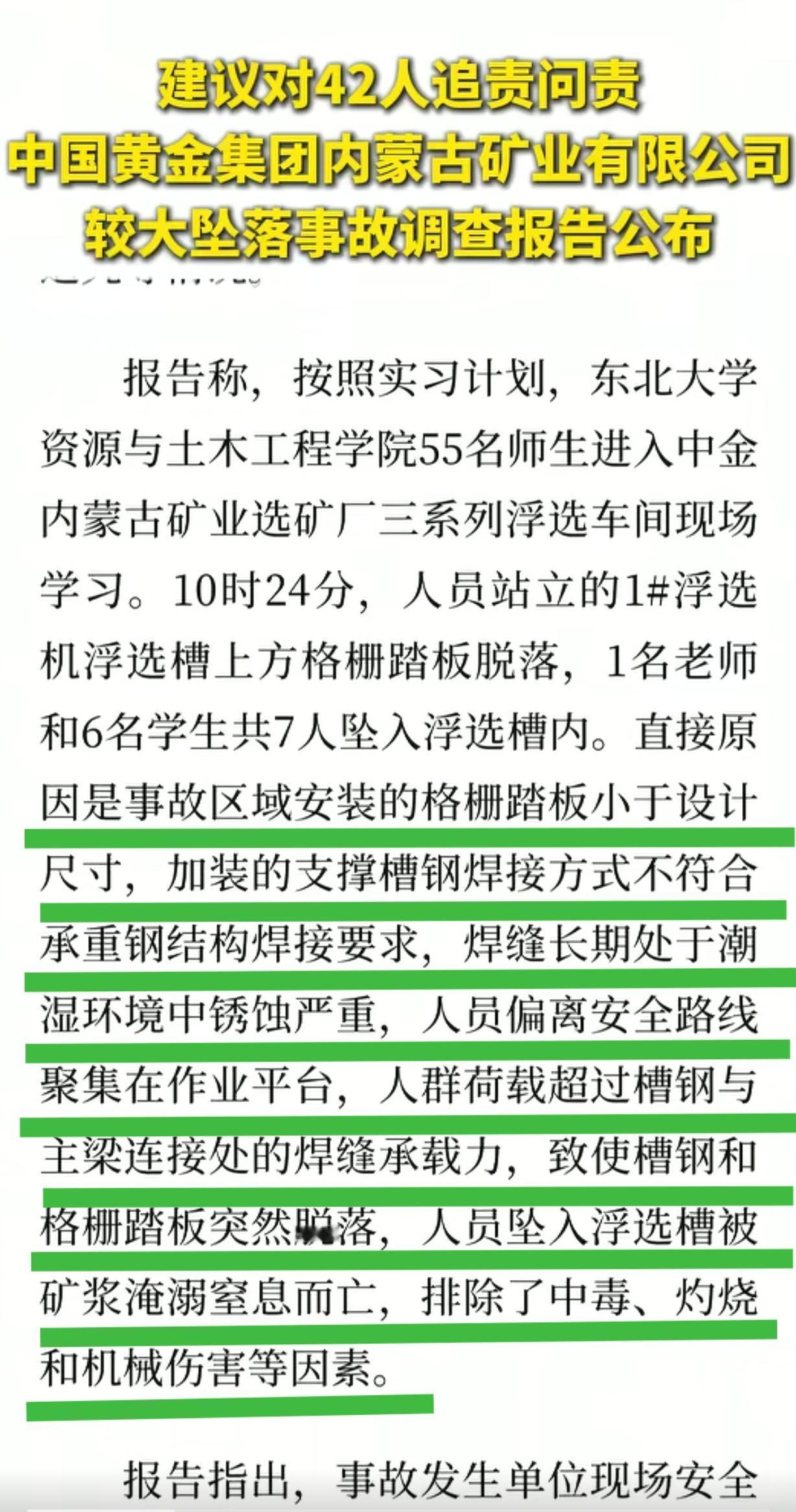 东北大学6名大学生实习黄金集团坠落溺亡,不是意外,而是系统性问题! 虽有42人被问责追责,但这些事故本来是可以避免的。 从不按设计进行施工建设,到设备设施焊接不符合承重要求,到日常维护问题发现不到位,到参观人员偏离安全路线缺乏实时管理……任何一个环节做到位了,这次事故都不会发生。 不算意外,也不能再出这类意外了! 大家怎么看? 6名大学生参观矿企坠亡调查报告公布如何看待东北大学6名学生溺亡事件 东北大学6名学生溺亡事故你怎么看