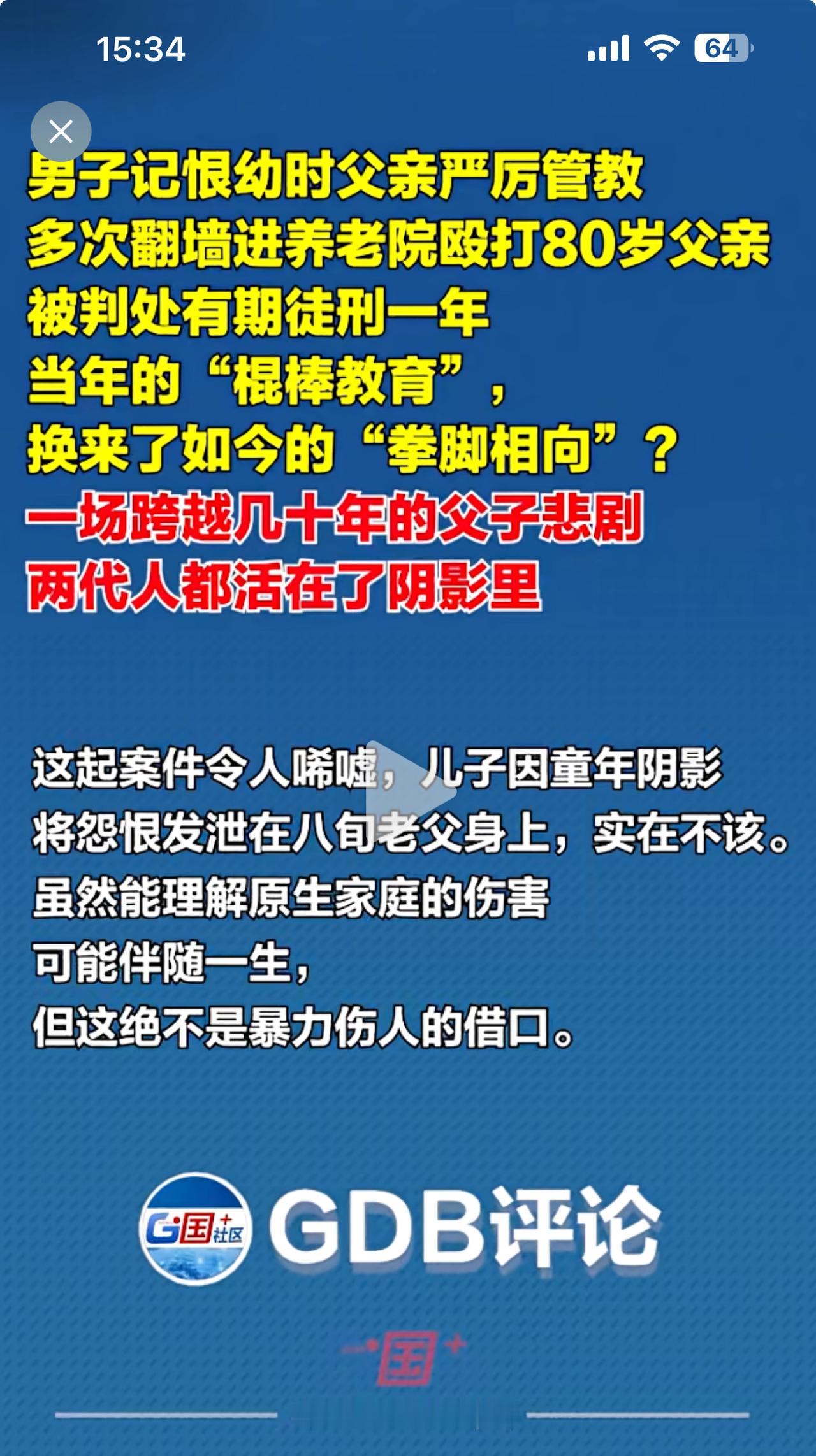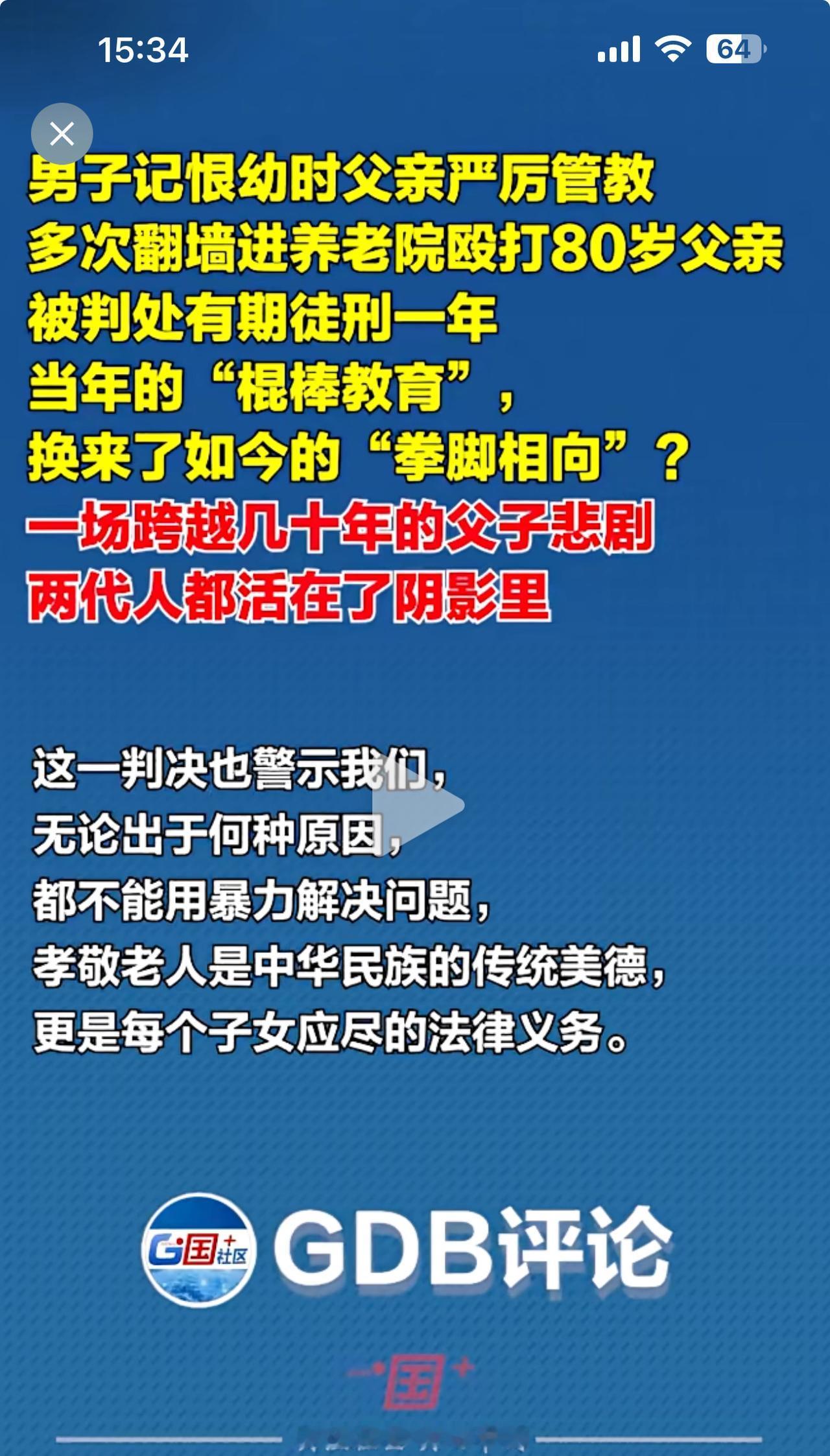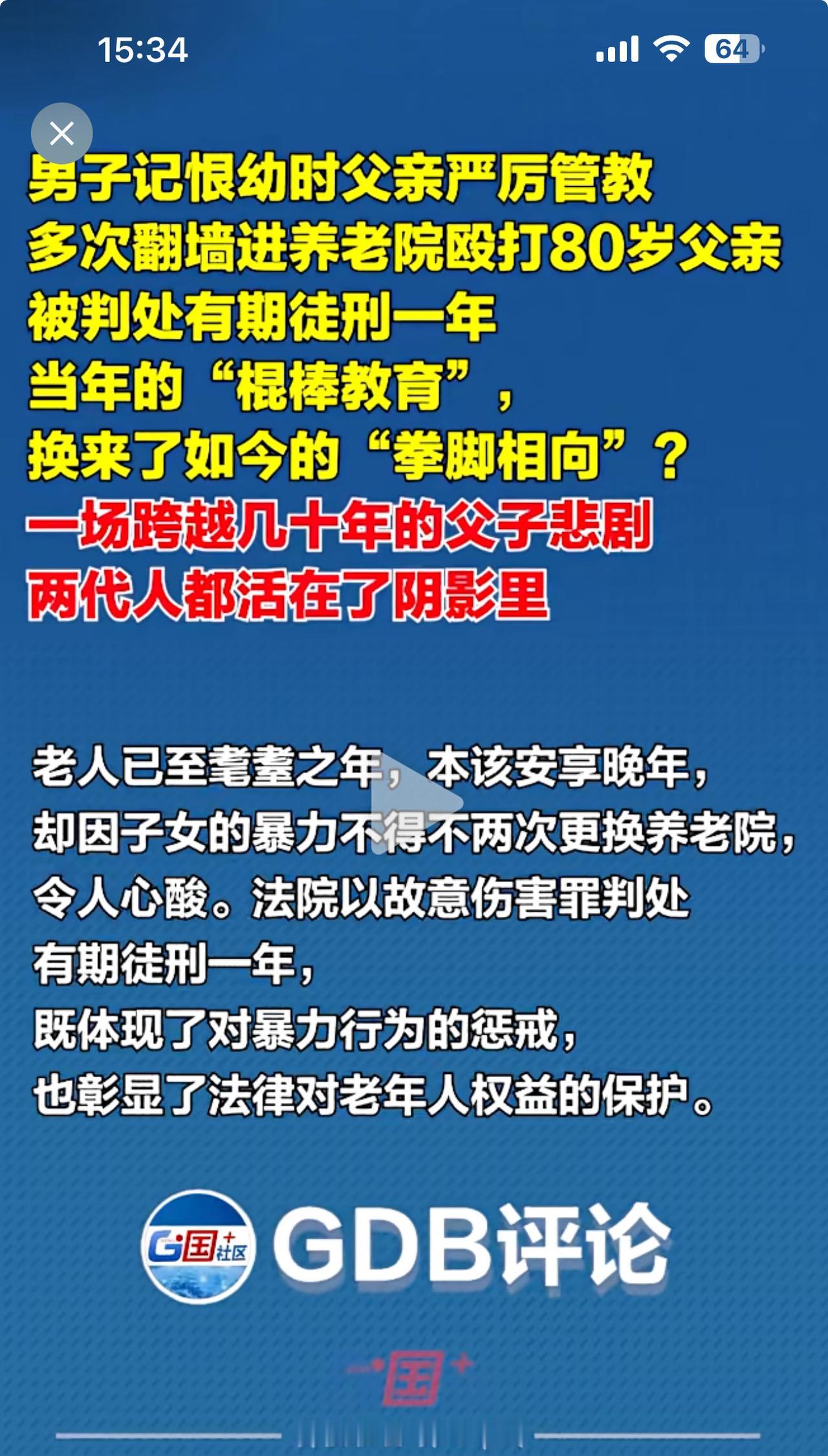 一男子多次翻墙进入养老院殴打80岁父亲!原因令人唏嘘!原来小时侯男子经常遭其父“棍棒教育”,一直记恨在心,于是去养老院殴打报复老爹! 国人常说棍棒之下出孝子!于是父母打骂孩子成为正常教育方式。看看这个例子就知道了,棍棒教育下出不了孝子,只会养出仇恨和心理扭曲。 做父母的还是不要对孩子使用暴力,否则到老了一切都会报应在自己身上。
