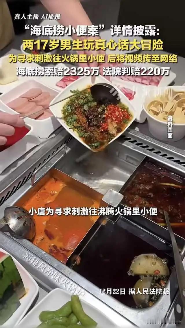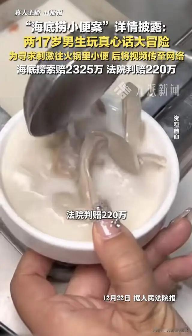 “海底捞小便案”终于有了判决结果,这起因一时“寻刺激”的荒唐行为引发的风波,不仅震惊了上海,更在全国范围内掀起了广泛的社会讨论。两名年仅17岁的少年,在玩“真心话大冒险”时,竟然选择往公共用餐环境中的火锅里小便,并将这一过程录视频上传网络,迅速引发了公众的强烈愤怒和质疑。 这不仅是对公共卫生安全的无视,更是对社会公德和他人权益的极大挑衅。作为国内知名餐饮品牌,海底捞不仅面临品牌形象的严重受损,还承担了事件后续清理和处理的高昂成本。面对高达2325万元的索赔,法院最终判决两名未成年人及其监护人需公开赔礼道歉,监护人还需赔偿220万元经济损失。这一判决传递出的信号不仅是法律的震慑,更是社会对公共文明底线的坚决捍卫。 透过这起事件,我们看见了当下青少年群体在网络环境和社会现实中,部分成长期迷失方向的缩影。未成年人因为求刺激而做出极端举动,反映出监管缺失、家庭教育和社会引导的不足。更值得反思的是,这种行为背后的网络传播效应——短视频时代,每一个荒唐举动都可能被无限放大,影响面广泛,造成难以估量的负面后果。 然而,判决并非故事的终点。正如社会各界热议,这也是一次契机——唤醒家庭、学校和社会共同关注未成年人心理健康和行为规范的警钟。我们需要更完善的青少年教育体系,更有力的法律监管,更广泛的社会共治,才能避免类似的荒唐事件重演。 海底捞尿火锅 火锅撒尿事件