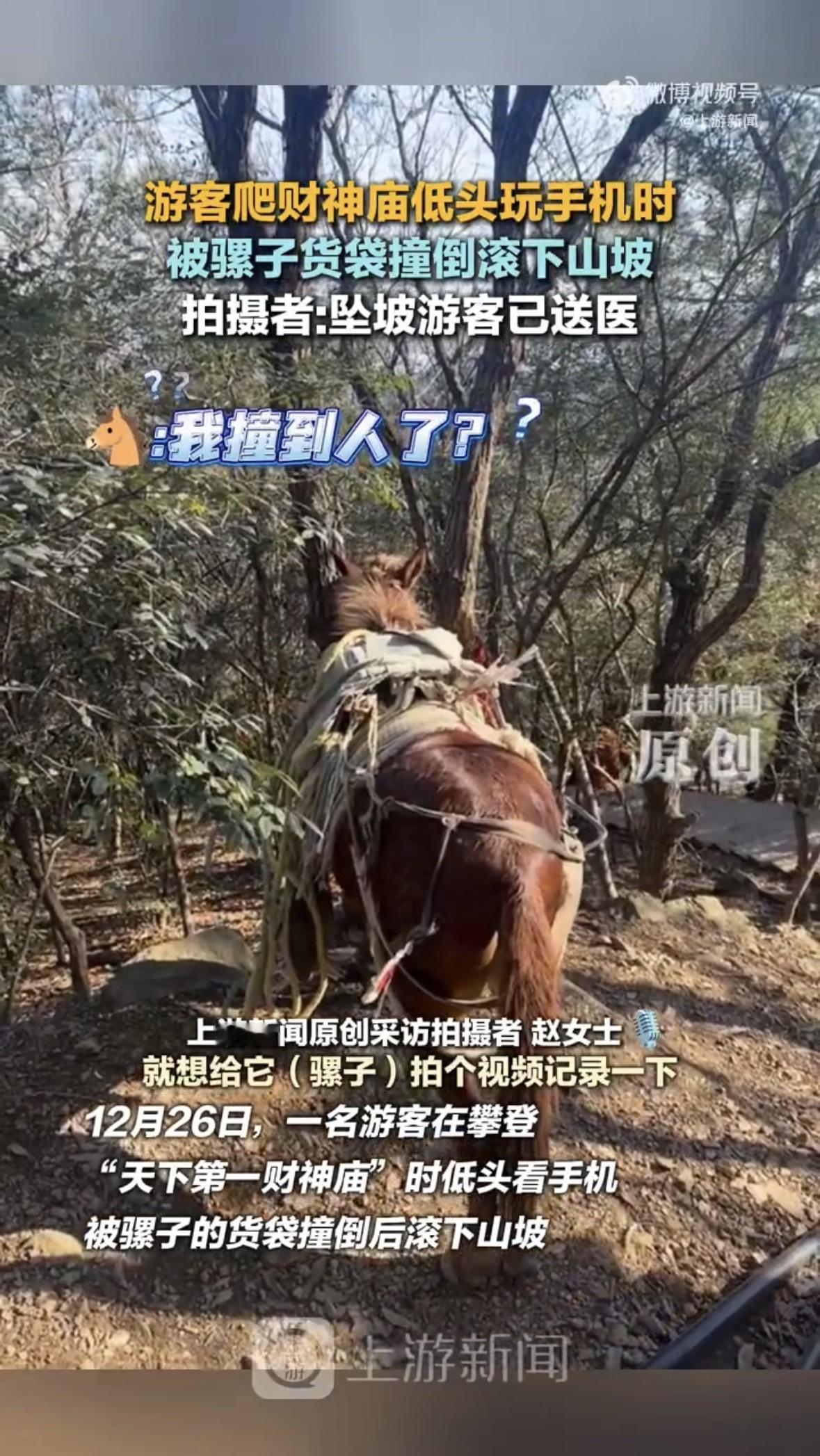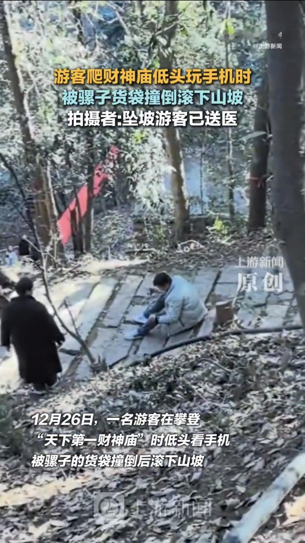 又是低头看手机惹的祸呀! 昨天杭州天下第一财神庙前,一游客边爬台阶边刷手机,愣是没注意到驮货的骡子,被货袋撞得滚下山坡! 看了下视频,真是惊险。所幸不是悬崖边,没出大事儿,该男子目前已在医院接受治疗,你说这低头一下子,危险在不知不觉中就降临了。 现在咱们走路、吃饭、坐车,手机几乎长在手上,可爬山那是实打实的台阶,一边是山壁一边是陡坡,低头刷手机还是得先保证在一个安全的环境,走路还是最好别刷了,更何况爬山呢。 老祖宗早说了“走路不看景,看景不走路”,套用一下就是,“走路不看手机,看手机不走路”,为了安全,咱该改还是得改啊。 你说今天这新闻,是不是比任何安全提示都来得实在?