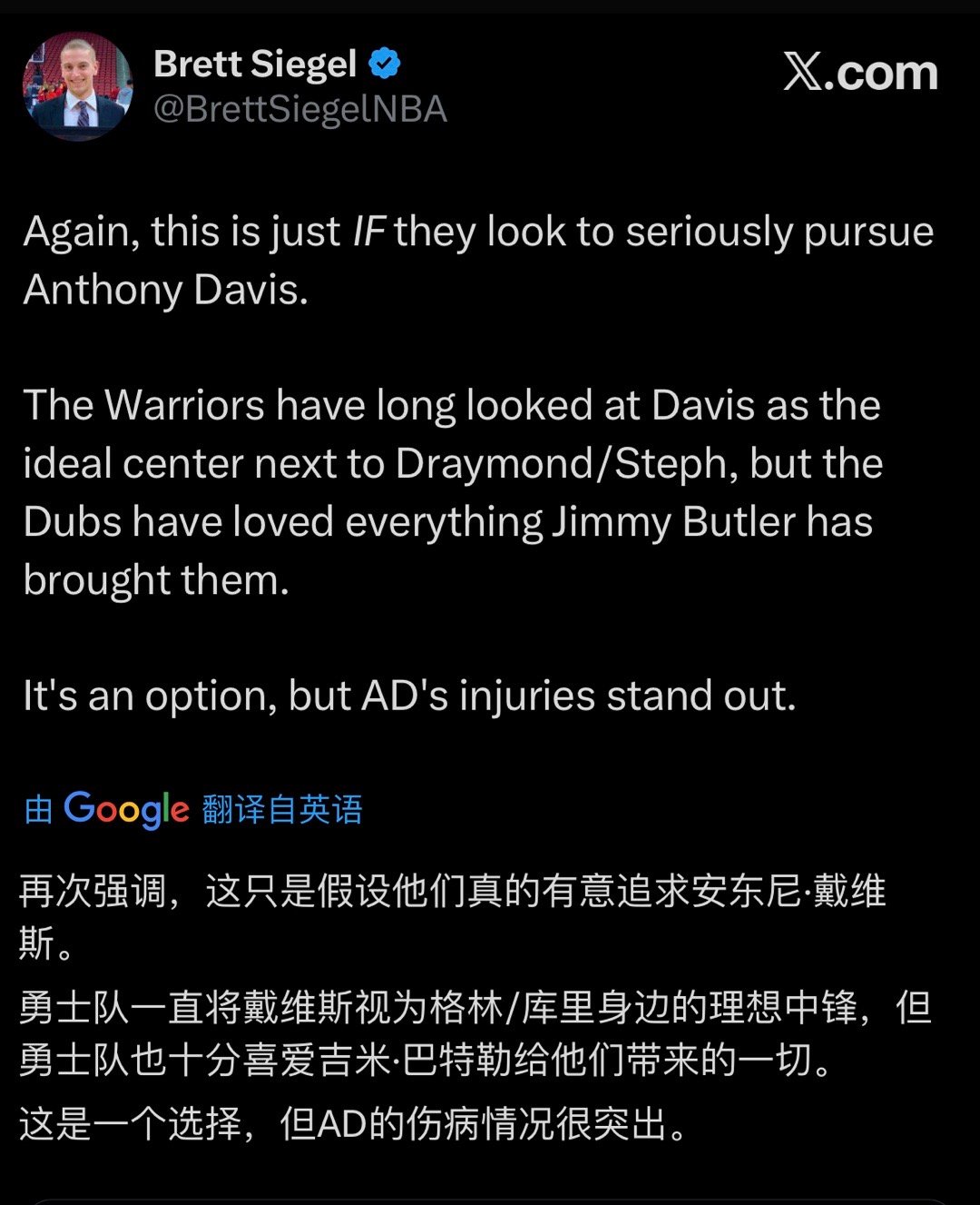 Brett Siegel:「如果勇士队真的想要追求安东尼·戴维斯,他们将尝试围绕吉米·巴特勒构建交易报价,同时保留乔纳森·库明加以用于其他补强除非库里、科尔和拉科布明确同意,否则金州勇士队绝不会交易德雷蒙德·格林。」不过该记者也表示,这只是在假设他们真的认真考虑追求浓眉的情况「虽然勇士队长期以来一直将浓眉视为与追梦和库里搭档的理想中锋,但球队也非常看重吉米·巴特勒所带来的一切这是一个可考虑的选项,但安东尼·戴维斯的伤病问题依然突出。」新赛季篮不住
