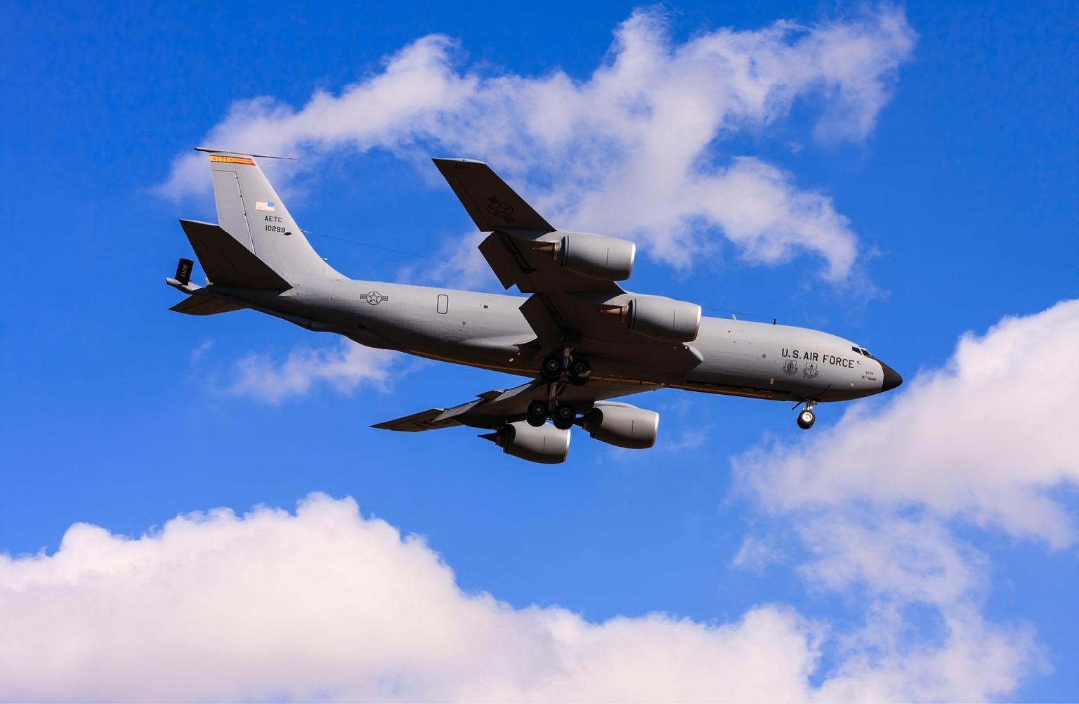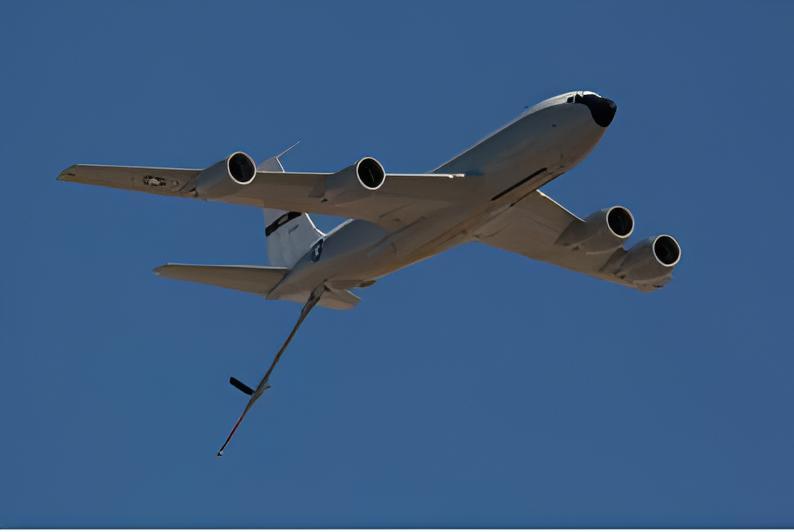 美国KC-135“同温层油船”空中加油机KC-135是美国空军第一架喷气式加油机,绰号为“同温层油船”(Stratotanker)。KC-135是波音公司在C-135军用运输机基础上改进而来的大型空中加油机。该机于20世纪50年代研制,1956年8月进行首飞,1957年正式列装。该机的总生产量为803架,主要用户为美国空军、法国空军、新加坡空军,土耳其空军和智利空军也有使用。KC-135的主翼后掠角为35度,翼下装有4台J57-P-59W涡轮喷气发动机,单台推力61千牛。该机的机体可分为上、下两个部分,上部分通常作为货舱使用,下部分则是燃油舱。机身后面部分是加油作业区,可装载90吨燃油。KC-135具备同时为多架飞机加油的能力,其伸缩套管式加油方式的输油率也很高。2002年,美国空军启动了KC-135“灵巧加油机”计划,改进后的KC-135加油机的性能更强,可使用不同的数据链在展区内进行通信联系,以便提高战区加油效率。|