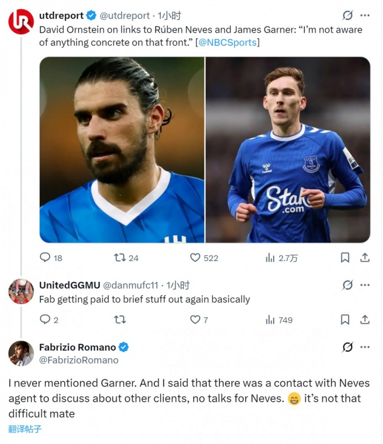 NBC记者奥恩斯坦在节目中表示,他没听说曼联引进鲁本·内维斯、加纳交易有任何实质性进展。