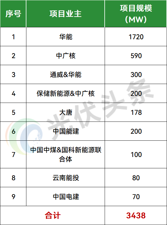 业主方面,华能、中广核、通威&华能、保储新能源&中广核、大唐、中国能建、中国中煤&国科新能源联合体、云南能投、中国电建9家企业或联合体获得指标。其中,华能获得1720MW,排名第一;中广核获得590MW,位列第二;通威&华能联合体获得300MW,排名第三。