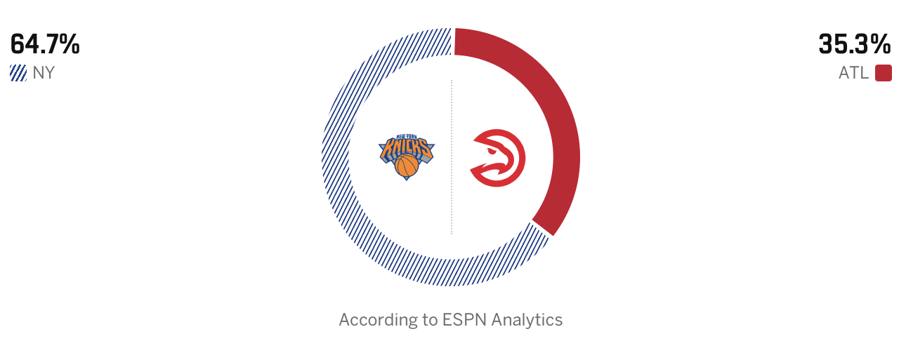 ESPN预测尼克斯vs老鹰:尼克斯胜率64.7%,老鹰胜率35.3%