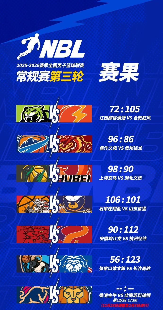 虎扑12月27日讯据NBL全国男子篮球联赛官方更新社媒,分享常规赛第三轮战况。