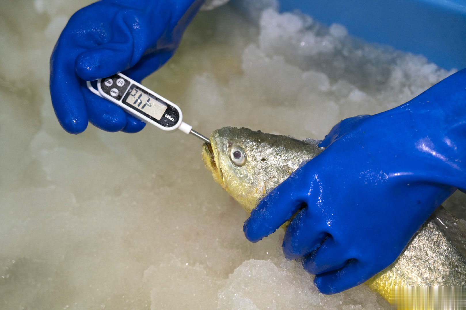 图/工作人员在给大黄鱼测体温