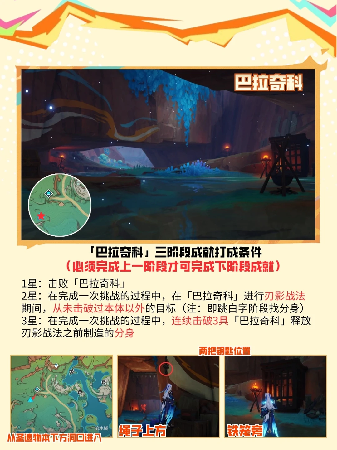 5.0新增纳塔地方传奇「巴拉奇科」打法/逃课/速通攻略![皱眉R] 需要打3个阶段,但可逃课[点赞R],具体方法可见p4 🌐地点:「巴拉奇科」位于纳塔区域·流泉之众北,秘境虹灵的净土的南部地下(可见p2) 营地的铁门需要2把钥匙解锁,一把在铁门上边的绳股处,另一把在铁门对面的木笼子内。