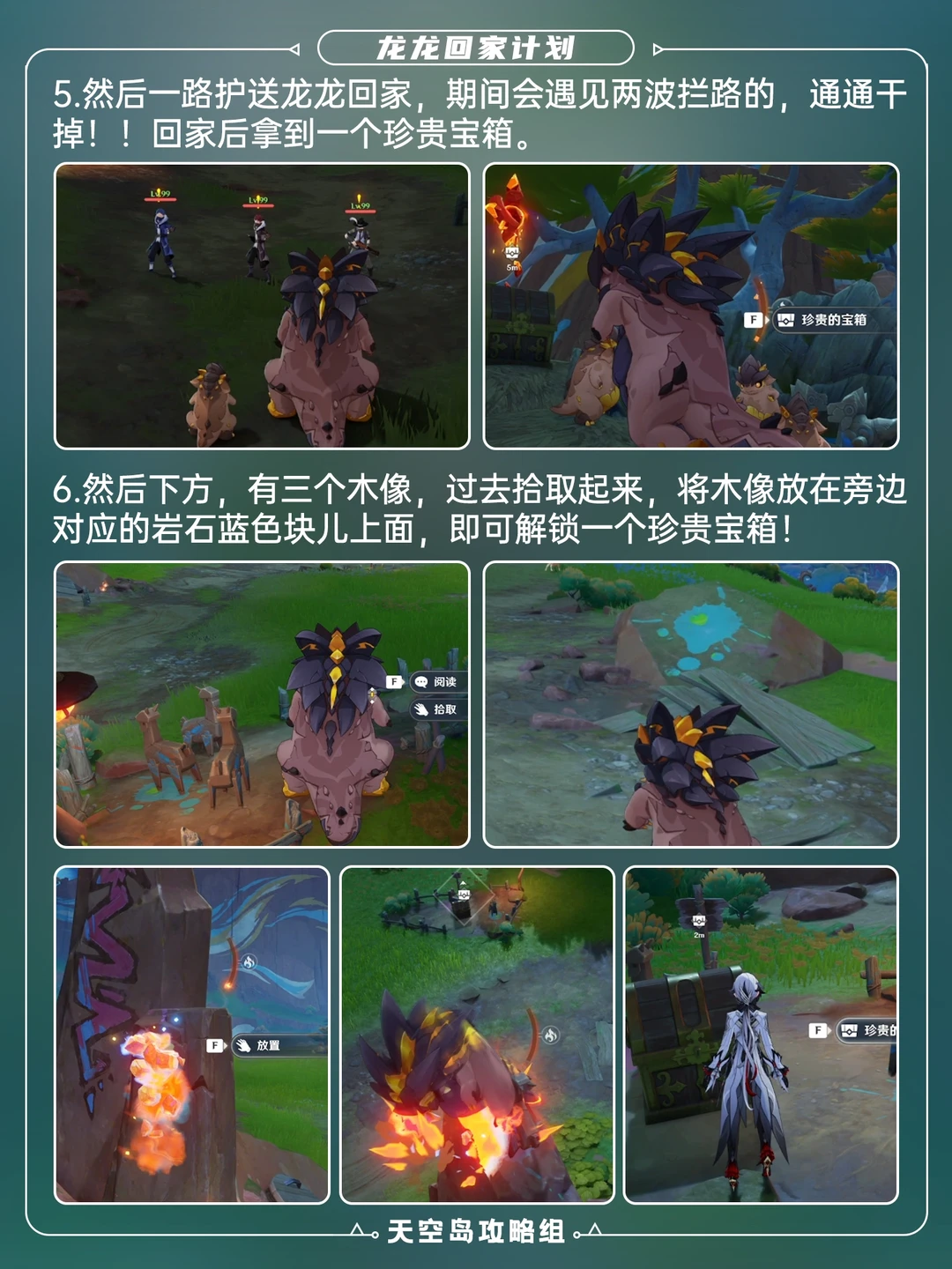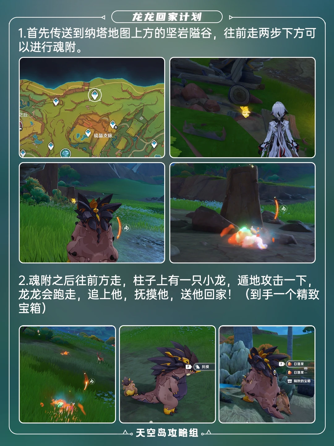 可获得2珍贵+1精致宝箱[哇R] 1⃣️到纳塔地图上方的坚岩隘谷传送点(p2),魂附。 2⃣️魂附后抚摸柱子上小龙,得到1精致宝箱 3⃣️p3为敌人位置,打完得到「奇怪的运龙车钥匙」,打旁边三个敌人,放出小龙 4⃣️护送龙龙回家,打掉拦路敌人,得到1珍贵宝箱 5⃣️拾取3木驼兽像,放到蓝色岩石块上,获得1珍贵