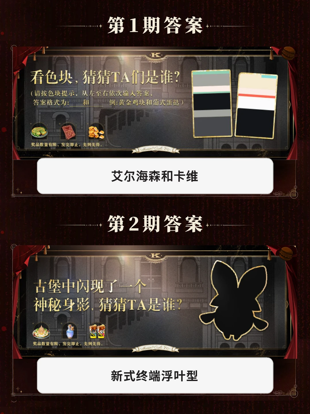 【肯德基联动活动进行中[哇R]】 问答已更完可获得原石、名片等奖励! 活动在KFC App中下拉二楼即可答题 第一期答案:「艾尔海森和卡维」 第二期答案:「新式终端浮叶型」 第三期答案:「627」 第四期答案:「OVOOVO」 肯德基答案:「OVOOVO」