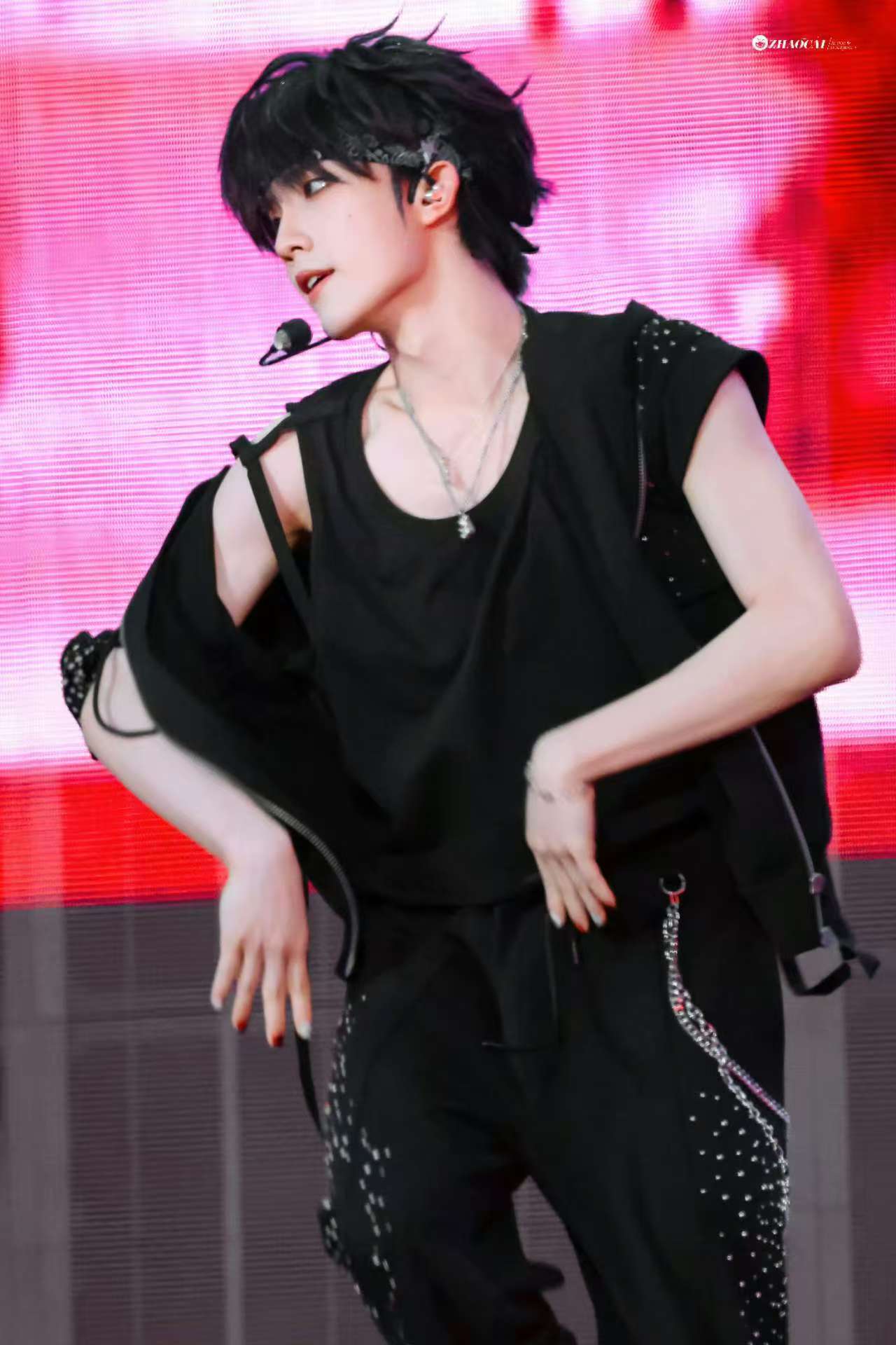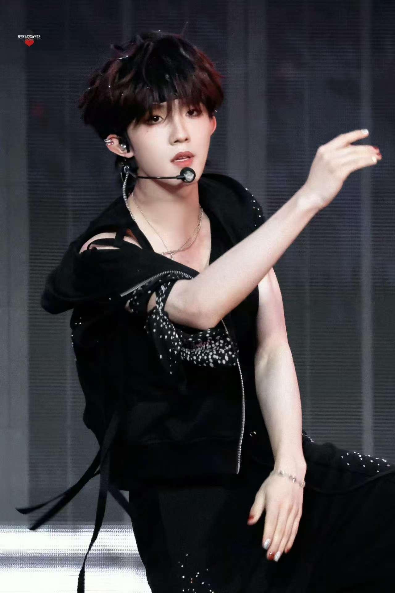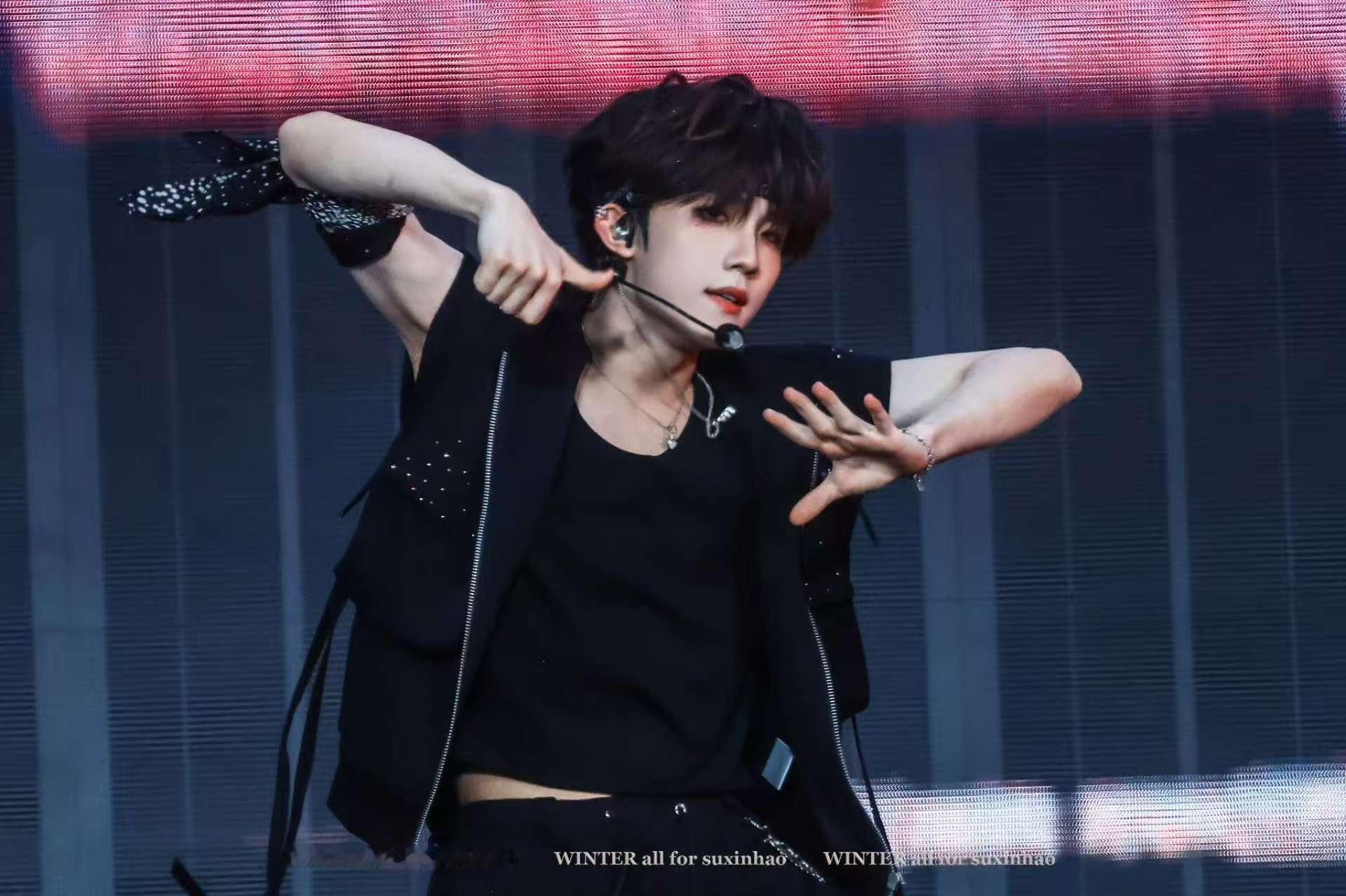 苏新皓无袖满分男 黑色无袖马甲好适合他❤️露出的手臂线条干净利落,配上全包眼线烟熏妆,整个人像随时要炸毛的小猫,《命》舞台氛围直接拉满。