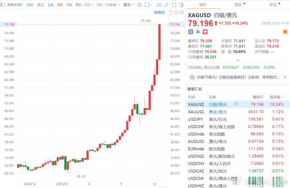 昨晚各种金属又涨疯了,白银暴涨11%,铜大涨5%,黄金上涨1.3%等。天天创历史新高,涨得让人窒息。截至目前,黄金今年涨幅72%,已经牛逼的不行了。但白银年涨幅172%,钯金涨幅122%,铂金年涨幅177%,通通吊打黄金。白银现货一周就涨了18%,这已经是拦不住了,要逼死空头的节奏啊!段子说,涉黄、买银、赌铂、铜性恋、投锡倒钯,今年但凡沾上一种都都发财了。果然致富密码都写在了刑法里。为什么国际金属板块这么猛,一是赌明年美联储大幅降息,全球资金在提前抢跑;二是各国都在预防美元和美债崩盘;三是铜、银、铝都有工业属性,受益于AI和新能源的爆发,已经是战略物质了;四是热钱煽风点火,黄金已经涨出牛市信仰了,开始形成越涨越买,越买越涨的史诗级逼空了!对A股来说,当下市场的两条主线,一条商业航天,另一条就是上游资源股。周五有色金属、锂矿共振大涨,紫金矿业、洛阳钼业均创历史新高!周末情绪这么火爆下,下周要继续奏乐继续舞了。