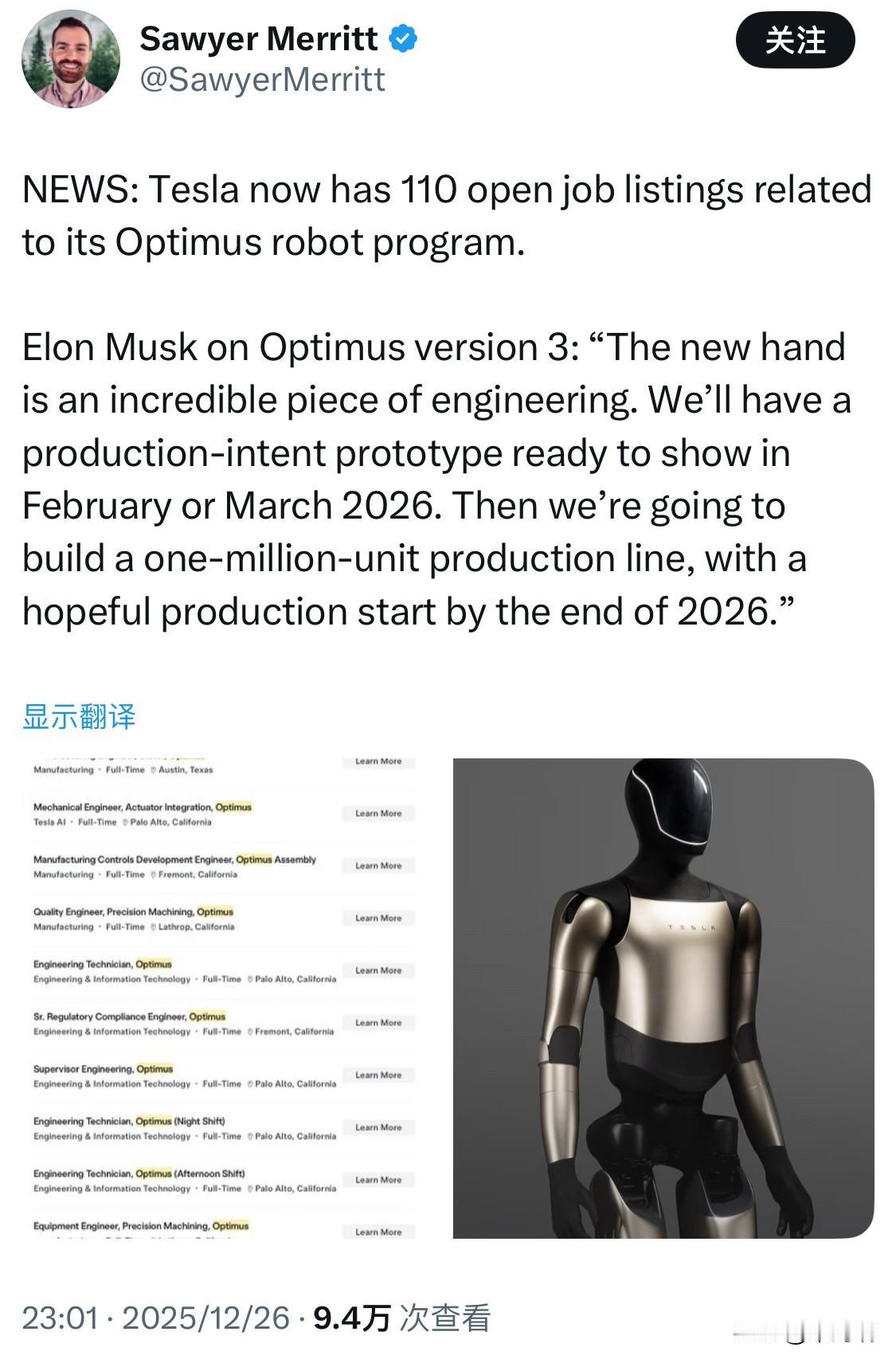 特斯拉新闻:特斯拉目前有 110 个与 Optimus 机器人项目相关的职位空缺。 埃隆·马斯克谈到Optimus第三代产品时说:“这款新型机械手是一项了不起的工程杰作。我们将在2026年2月或3月推出量产原型。之后,我们将建造一条年产100万台的生产线,并希望能在2026年底前开始投产。” 特斯拉在 2025 年原计划生产约 5,000 台 Optimus,但截至年中实际产量仅为数百台。尽管面临挑战,马斯克仍致力于在 2025 年底前实现工厂内部的初步应用。 Optimus预计量产后的最终售价将在 20,000 美元至 30,000 美元 之间(约合人民币 14-21 万元)。 长期愿景: 目标是到 2030 年实现每年 100 万台的产能。马斯克认为 Optimus 将成为特斯拉未来价值的核心,甚至在未来能够协助执行外科手术或提供家庭护理服务。