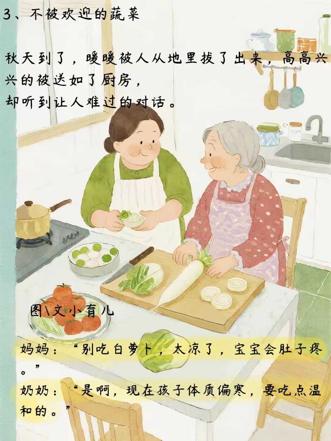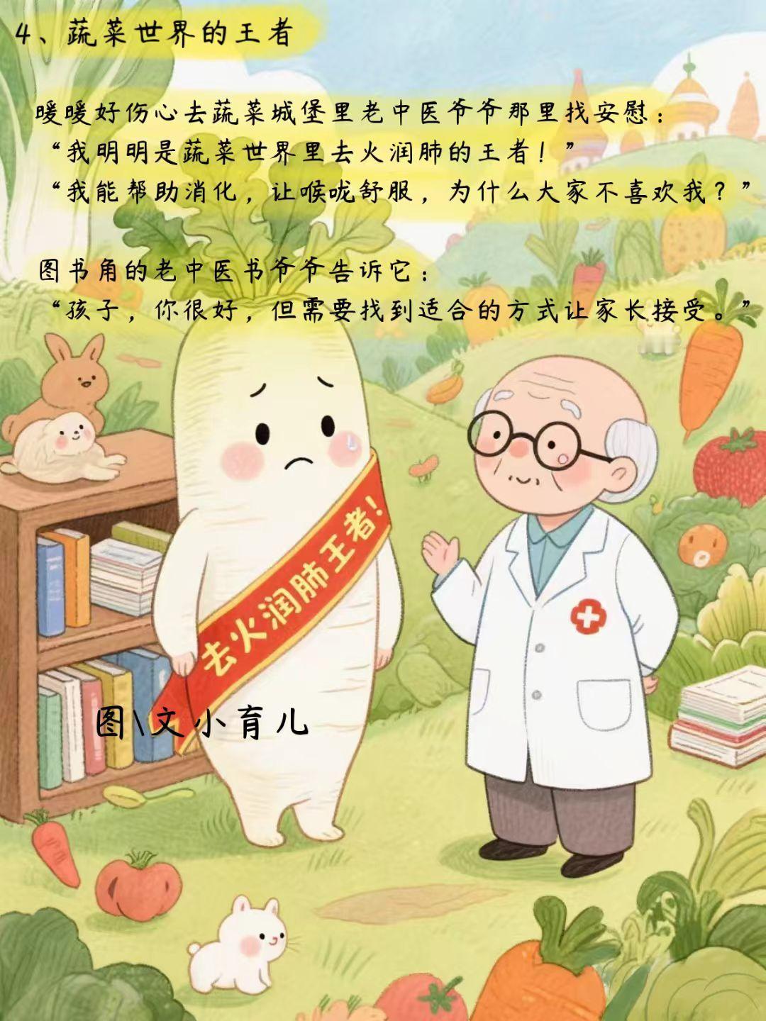 这个充满童趣的手绘故事讲述了一根白萝卜的奇妙历险。 通过主人公面对困境时的独特应对方式——既不盲目对抗环境,也不轻易否定自我,而是以柔克刚、顺势而为,展现了东方哲学中上善若水的处世智慧。 故事巧妙地将三个重要理念融入其中: 1. 每种食材都有其独特价值,关键在于找到合适的搭配方式 2. 传统食材经过创新烹饪,可以更好地满足现代人的营养需求 3. 鼓励孩子们探索不同蔬菜的特性,培养健康的饮食习惯创意图片故事 手绘童话故事 儿童绘本 在潜移默化中,孩子们不仅能感受到传统文化的智慧,还能学习到实用的营养知识。这种寓教于乐的叙事方式,让健康饮食的理念如春风化雨般深入人心。 儿童健康