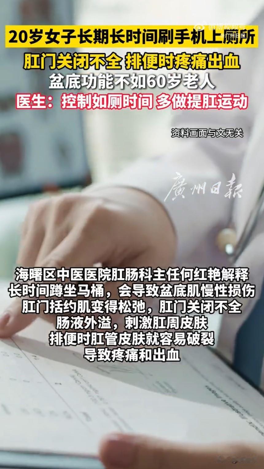 长期如厕刷手机20岁女生盆底已60岁! 浙江宁波一位20岁的年轻女生,最近因为肛门疼痛、便血鲜红的症状来到医院就诊,检查结果让所有人都大吃一惊,她的盆底功能评分竟然比很多老年人还要低,甚至连肛门括约肌都变得松弛,肛门关闭不全,肠液外渗破坏了肛周皮肤,导致排便时肛管皮肤很容易破裂。而造成这一切的罪魁祸首,正是很多人都有的一个坏习惯:上厕所时长时间刷手机。 医生在详细问诊后了解到,这位女生长期以来都有边刷手机边排便的习惯,每次在马桶上一坐就是二三十分钟,正是这种长时间蹲坐的行为,成为了她盆底肌严重受损的根本原因。医生还表示,像这位女生这样因长时间蹲坐马桶导致盆底损伤的年轻患者,近年来已经有了明显的增加趋势。 其实,这个问题现在越来越普遍了。很多年轻人都有边如厕边看手机的习惯,一坐就是十几二十分钟,大家可能觉得这没什么大不了的,顶多就是耽误点时间,但医生提醒,长时间蹲坐会给盆底肌带来很大压力,就像一根橡皮筋,老被拉长就会失去弹性,慢慢松弛下来。 如果这种不良习惯得不到及时纠正,后期可能会出现肛门潮湿、控便能力下降等问题,严重影响我们的生活质量。肛门潮湿不仅会让我们感到不适,还可能引发皮肤炎症;而控便能力下降则会给我们的日常生活带来很多不便,比如在公共场合可能会出现漏便的情况,这会让我们感到非常尴尬。 其实,想要改变这个坏习惯并不难。首先,我们可以在马桶旁放一个小凳子,让自己的身体保持一个更自然的姿势,这样可以减少盆底肌的压力。其次,我们可以在如厕时尽量减少看手机的时间,专注于排便过程。如果实在忍不住想玩手机,可以设置一个闹钟,提醒自己不要超过十分钟。 另外,我们还可以通过一些简单的运动来锻炼盆底肌,比如凯格尔运动。凯格尔运动可以帮助我们增强盆底肌的力量和耐力,让它更好地发挥支撑作用。具体的做法是:收缩盆底肌肉,保持三到五秒,然后放松,重复这个动作,每次做十到十五分钟,每天做两到三次。 健康从来都不是小事,尤其是像盆底肌这样和我们日常生活息息相关的部位,别让一个小小的习惯,给未来的健康埋下隐患。从现在开始,放下手机,专注排便,给我们的身体多一点关爱吧! 来源:广州日报