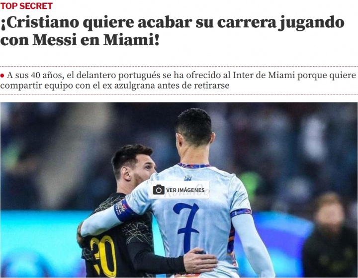 直播吧12月28日讯今天是西班牙的愚人节,《世界体育报》发布了一篇趣味报道,声称C罗主动请缨欲加盟迈阿密,与梅西做队友,文章内容夸张不失幽默。报道全文编译如下,请大家带着娱乐和轻松的心态阅读: